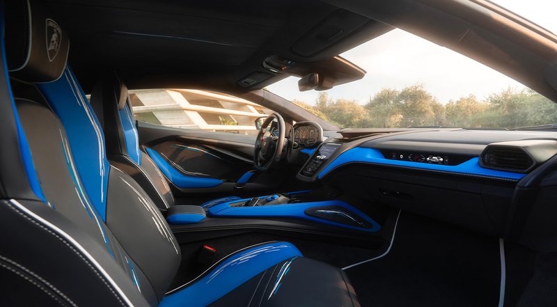 Περνώντας στο εσωτερικό, παρόμοια είναι η χρωματική παλέτα που έχει χρησιμοποιηθεί. Σύμφωνα με την αυτοκινητοβιομηχανία, μόνο τα κεντήματα της καμπίνας στη συγκεκριμένη Revuelto χρειάστηκαν 85 ώρες για να ραφτούν. Η εταιρεία δημιούργησε ένα εντελώς νέο εργαλείο, ώστε το κέντημα να έχει το εφέ του νερού, με τις αποχρώσεις Blu Amon, Blu Chepeus και Biacno Leda.