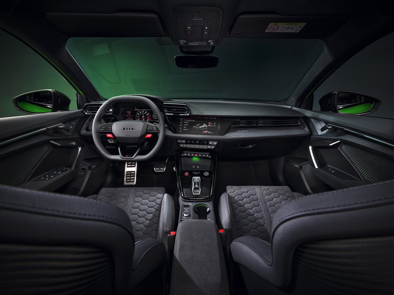 Περνώντας στο εσωτερικό, οι Γερμανοί έχουν επιλέξει bucket καθίσματα από ανθρακόνημα, τα οποία ντύνονται με έναν συνδυασμό δέρματος Nappa κι υφάσματος από μικροΐνες, τα οποία βέβαια δεν προσφέρονται στον βασικό εξοπλισμό. Η καμπίνα του Audi RS3 έχει εξοπλιστεί με δύο οθόνες, μια 12,3 ιντσών στη μεριά του οδηγού που τελεί χρέη ψηφιακού πίνακα οργάνων και μια 10,1 ιντσών που έχει τοποθετηθεί στην κεντρική κονσόλα και προορίζεται για τον χειρισμό του συστήματος infotainment κι άλλων λειτουργιών του οχήματος.