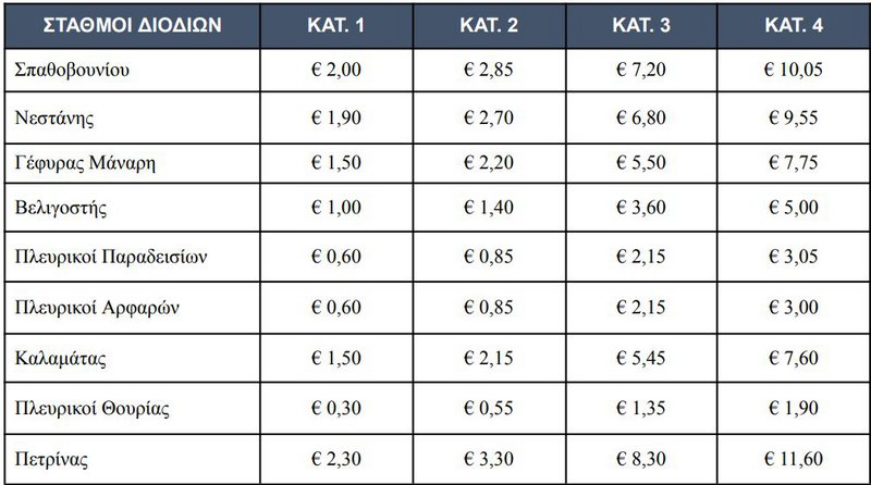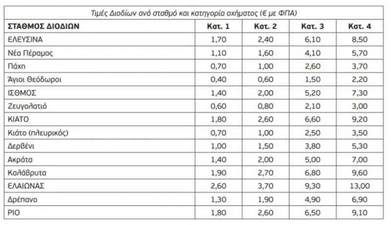 Δείτε αναλυτικά τις νέες τιμές των διοδίων που ανακοίνωσαν οι παραχωρησιούχοι: