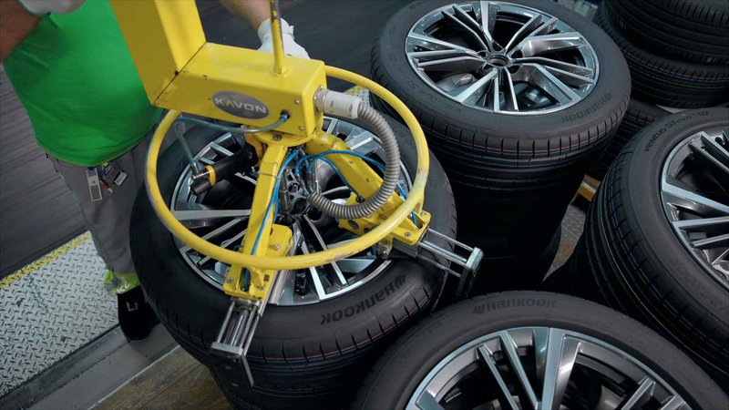 Πώς γίνεται αυτό; Με τους συγκεκριμένους χειριστές, που ελέγχονται από πνευματικά κυκλώματα και έχουν σχεδιαστεί ώστε να τοποθετούν τους τροχούς άμεσα και με ακρίβεια χωρίς να καταστρέφονται οι ζάντες, αλλά ούτε και οι θόλοι των τροχών. Μπορούν να χειριστούν ζάντες με διάμετρο από 16 έως 21 ίντσες. Στη συνέχεια, ένας άλλος «χειριστής» έρχεται και σφίγγει ταυτόχρονα και τα 4 μπουλόνια του τροχού.