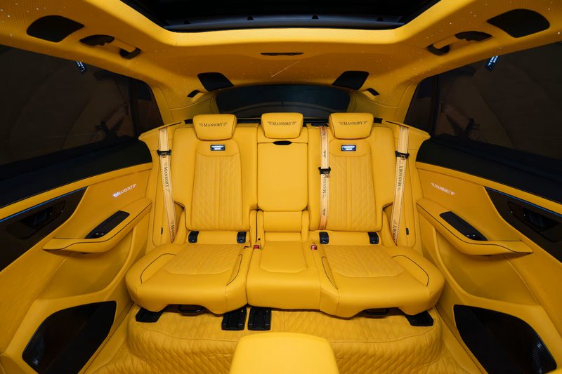 Στο εσωτερικό, ο κόσμος της υπερβολής συνεχίζεται. Όλη η καμπίνα είναι ντυμένη με κίτρινο δέρμα – από τα καθίσματα και το τιμόνι, μέχρι την επένδυση οροφής και το πάτωμα. Η πανοραμική οροφή περιβάλλεται από ένα «ουρανό με αστέρια», παρόμοιο με αυτόν που συναντάμε σε μοντέλα της Rolls-Royce.