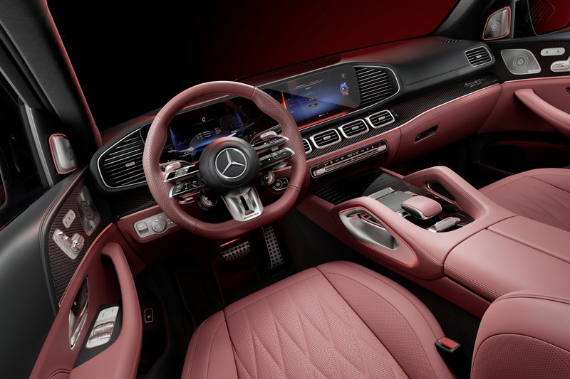 Στο εσωτερικό, το AMG MANUFAKTUR Carmine Red Exclusive Nappa Leather δεσπόζει στα καθίσματα, τις πόρτες και το τιμόνι, ενώ δε λείπει ούτε εδώ η αντίθεση με το μαύρο χρώμα, αλλά και το ανθρακόνημα που προσδίδει στον σπορ χαρακτήρα των μοντέλων.