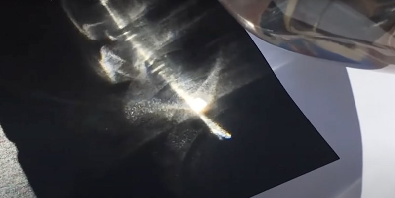 Για να το δείξει και σχηματικά, ο κ. Richardson πήρε ένα μικρό μπουκάλι, το τοποθέτησε μπροστά από ένα μαύρο κομμάτι χαρτί, και χάρη στο φαινόμενο που περιέγραψε νωρίτερα, το χαρτί άρχισε να καίγεται.