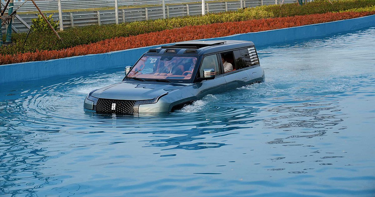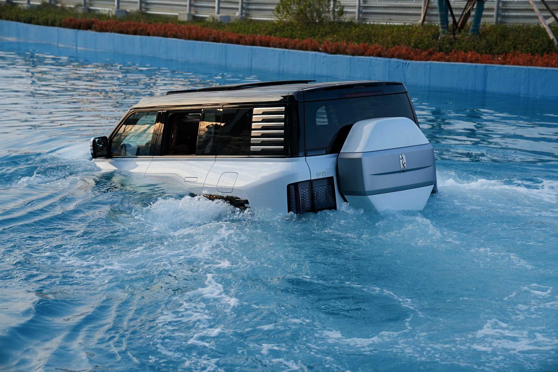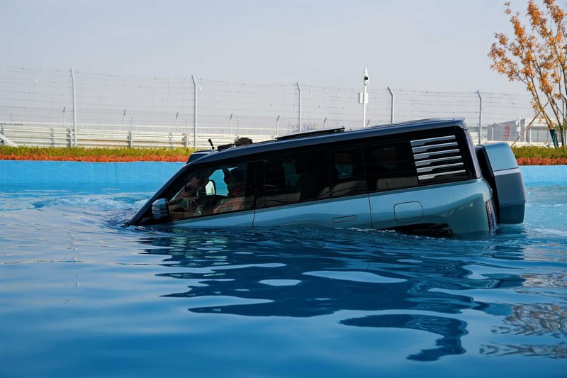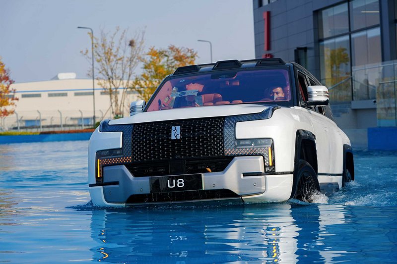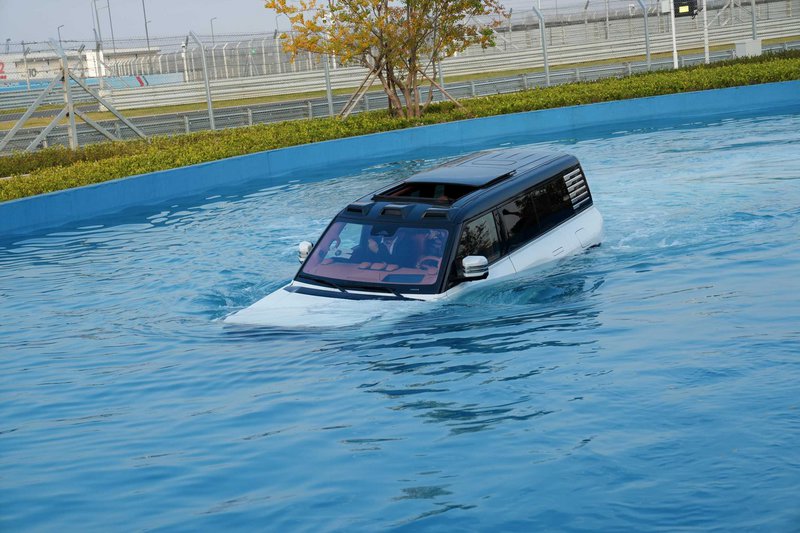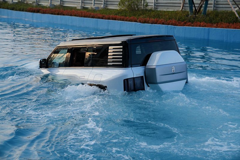 Το μυστικό της αμφίβιας συμπεριφοράς του κρύβεται στην στεγανότητα του πλαισίου. Με πιστοποίηση IP68 για όλα τα ηλεκτρικά μέρη και σασί με μπόλικο αλουμίνιο τύπου Body-on-Frame, το U8 μπορεί να επιπλέει στο νερό. Ενεργοποιώντας το ειδικό “Emergency Floating Mode”, οι εξαερισμοί κλείνουν, η αερανάρτηση σηκώνει το αμάξωμα στο μέγιστο ύψος των 580 mm, και το αυτοκίνητο μετατρέπεται σε… πλωτό όχημα. Οι τροχοί λειτουργούν σαν πτερύγια, προωθώντας το με ταχύτητα μέχρι και 3 km/h σε ήρεμα νερά, ενώ η απόσταση από το έδαφος φτάνει τα 320 mm, με δυνατότητα διέλευσης από νερό βάθους έως 1 μέτρο πριν καν ενεργοποιηθεί το αμφίβιο πρόγραμμα.