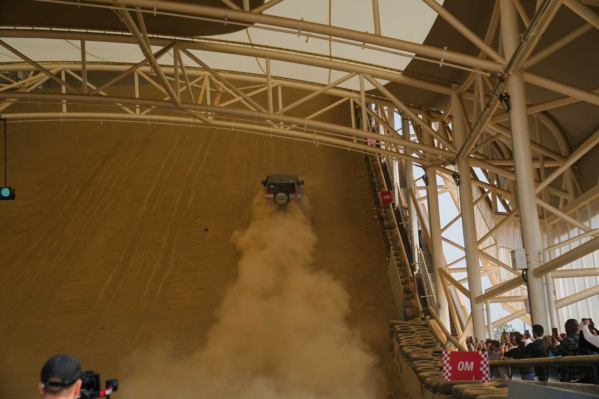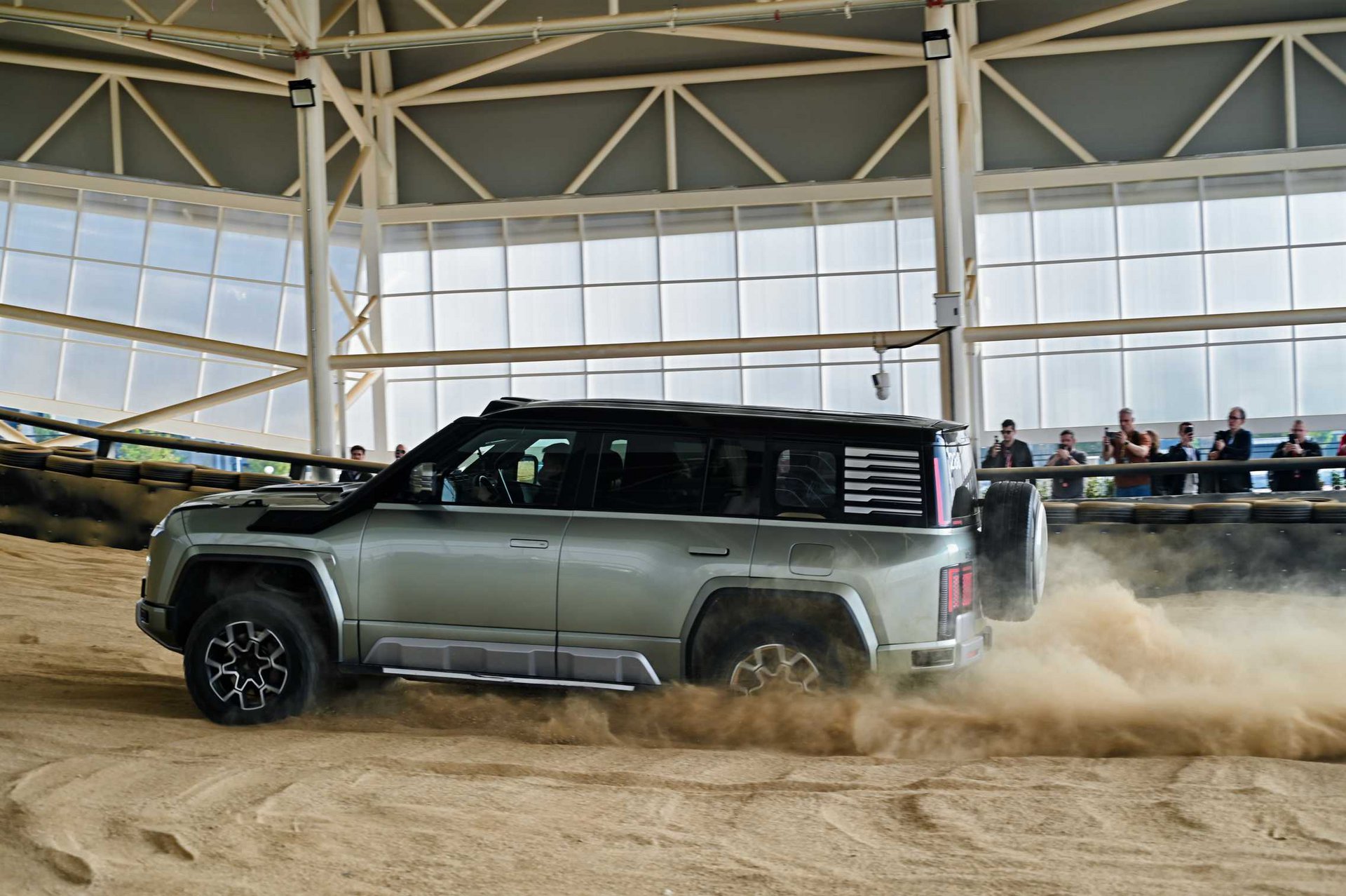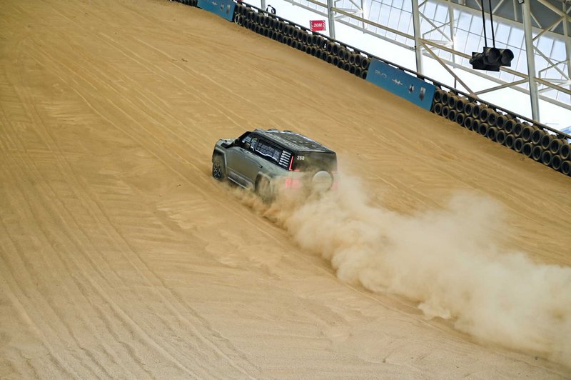 Αφού κάναμε τη βόλτα μας στην πισίνα και επιστρέψαμε, σειρά είχε να δούμε το κάνει το αυτοκίνητο και εκτός δρόμου στην παρακείμενη πίστα-αμμόλοφο, τη μεγαλύτερη σκεπαστή στον κόσμο. Εδώ, η αερανάρτηση μεταβαλλόμενου ύψους του U8 με 15 cm διαδρομή και το σύστημα τετραπλής ενεργής απόσβεσης διαβάζουν το έδαφος και ρυθμίζουν σε πραγματικό χρόνο τη σκληρότητα της απόσβεσης και το ύψος του πατώματος από το έδαφος. Παράλληλα, η πίεση των ελαστικών προσαρμόζεται αυτόματα για μέγιστη επαφή με το έδαφος, κάτι ιδιαίτερα χρήσιμο όταν το SUV σκαρφαλώνει σε αμμόλοφους. Οι γωνίες προσέγγισης 37°, διαφυγής 33° και πλευρικής κλίσης 25° αποδεικνύουν ότι η σχεδίαση έχει γίνει με γνώμονα το εκτός δρόμου στοιχείο.