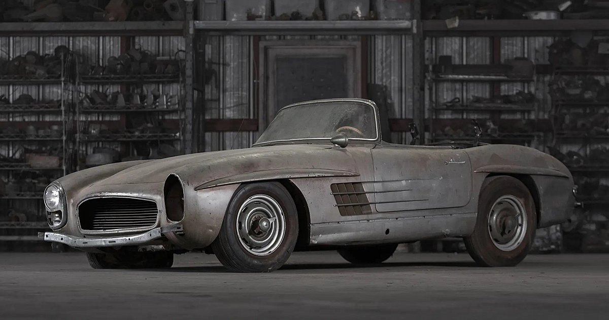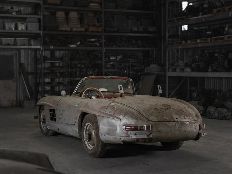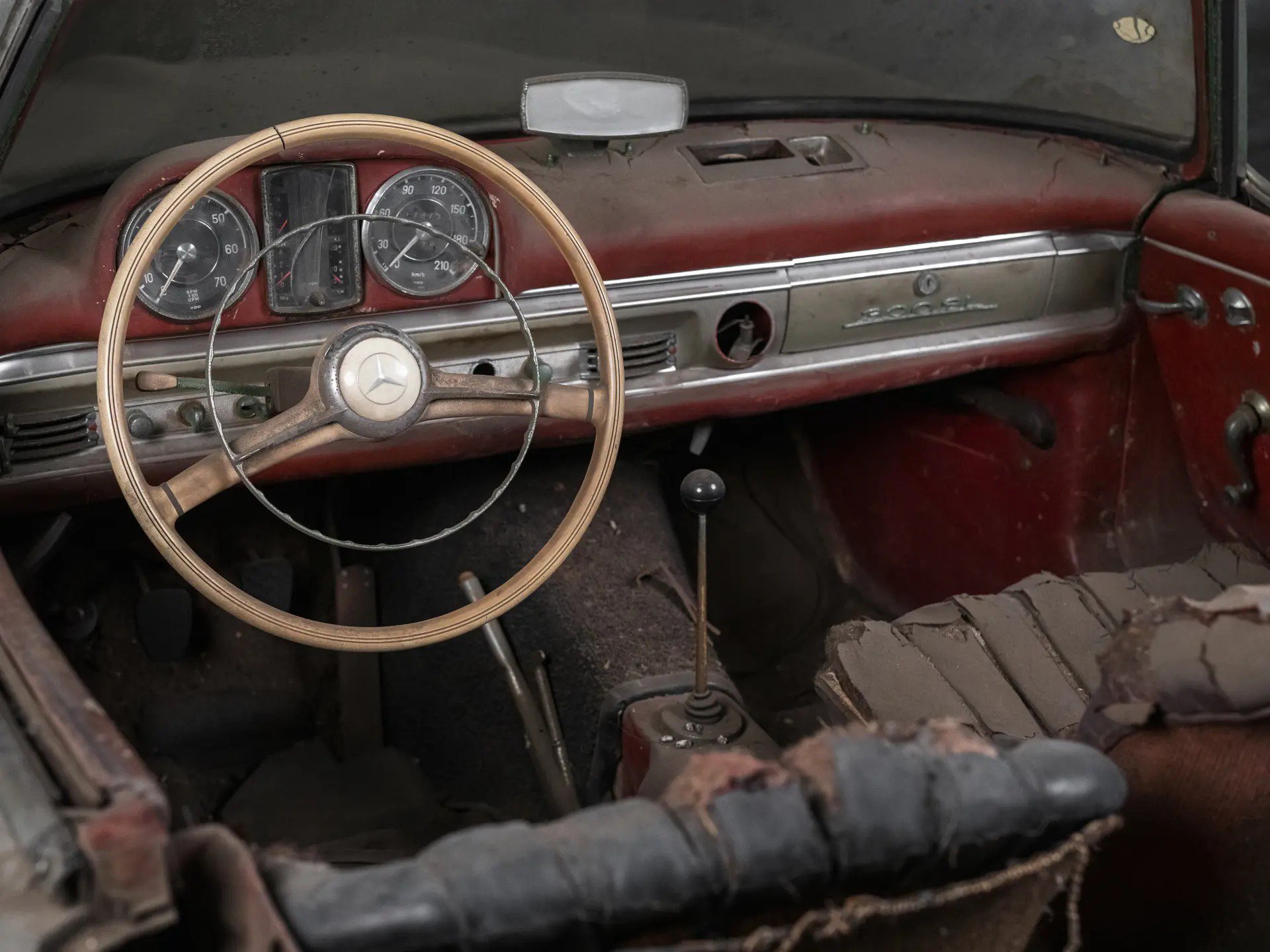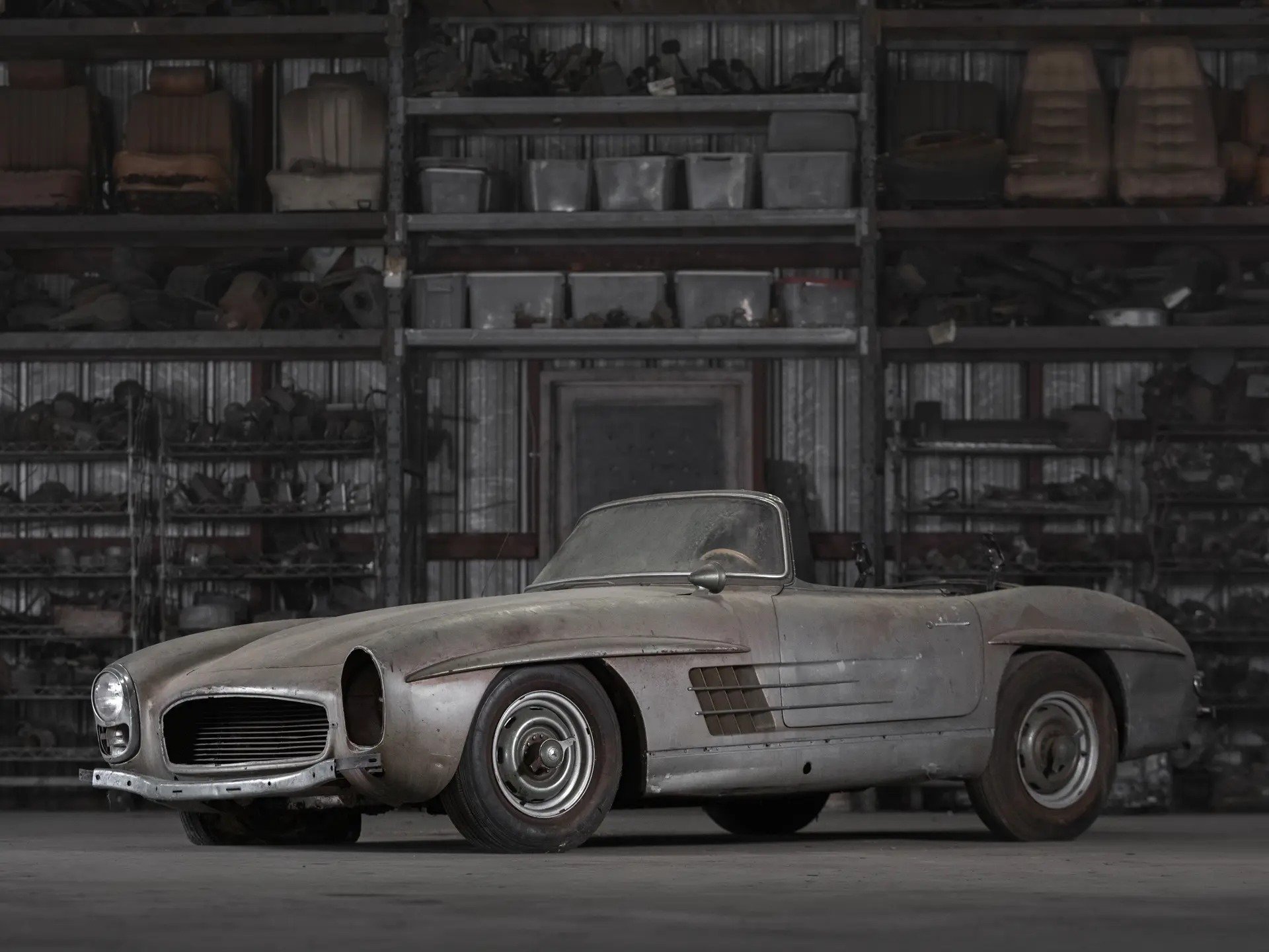 Φινιρισμένη στην απόχρωση Fire Engine Red, η συγκεκριμένη 300 SL Roadster παρέμεινε παρατημένο σε μια μάντρα στη Ν. Καλιφόρνια για αρκετές δεκαετίες, και αυτό είναι εμφανές. Κάθε επιφάνεια τόσο του εξωτερικού, όσο και του εσωτερικού, ήταν καλυμμένη με χώμα και σκόνη, ενώ αρκετά σημεία του αμαξώματος και του σαλονιού ήταν κατεστραμένα. Για παράδειγμα, ένα από τα δύο φωτιστικά σώματα στο εμπρός μέρος έχει αποχαιρετήσει τη θέση του.