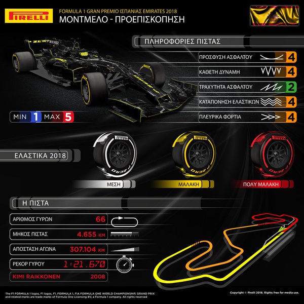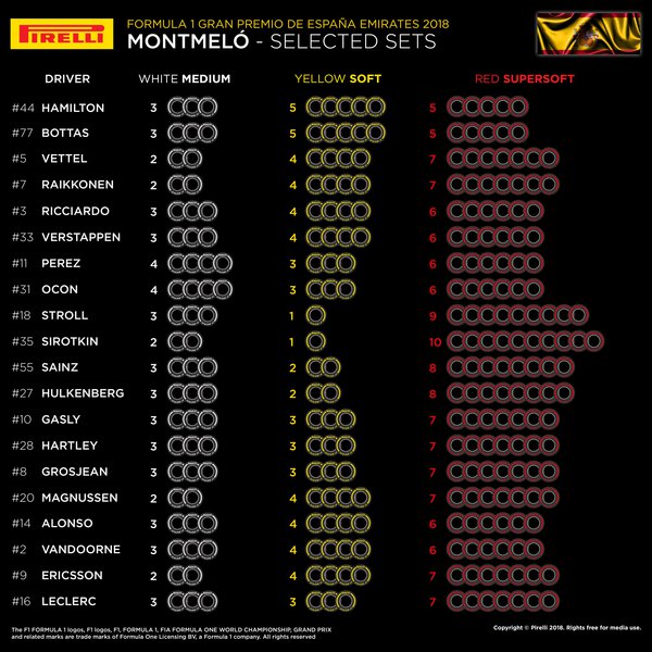 Η επιλογή ελαστικών για το Ισπανικό Grand Prix είναι πιο μαλακή φέτος, με την πολύ μαλακή γόμα (supersoft) να κάνει ντεμπούτο στο «Circuit de Catalunya» μαζί με τη μαλακή (soft) και τη μέση (medium) γόμα. Πάντοτε στο παρελθόν χρησιμοποιούνταν το πιο σκληρό ελαστικό σ’ αυτή την πίστα. Φέτος όμως υπάρχει νέος ασφαλτοτάπητας τον οποίο οι ομάδες δοκίμασαν για πρώτη φορά στις χειμερινές δοκιμές εξέλιξης πριν δυο μήνες. Αυτό διαφοροποίησε την πολυπλοκότητα της πίστας στη Βαρκελώνη, προσφέροντας μεγαλύτερη πρόσφυση αλλά μειωμένη φθορά και πτώση στην απόδοση λόγω υπερθέρμανσης. Δεν είναι όμως αυτό το μόνο καινούργιο πράγμα στη Βαρκελώνη αυτό το Σαββατοκύριακο.