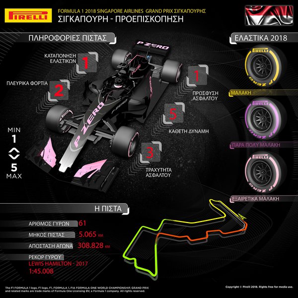 Το Grand Prix της Σιγκαπούρης διεξήχθη πρώτη φορά το 2008, φέτος κλείνει 10 χρόνια. Η δε διαδρομή έχει 23 στροφές τις περισσότερες από κάθε άλλη πίστα της F1. Αυτό σημαίνει πως τα ελαστικά δουλεύουν συνεχώς κατά τη διάρκεια του γύρου. Το δε πίσω αριστερά ελαστικό καταπονείται περισσότερο στη Σιγκαπούρη, στον δεύτερο πιο αργό σε ρυθμό γύρο πρωταθλήματος, μετά απ’ αυτόν στο Μονακό. Πέρυσι ο Sebastian Vettel έσπασε το ρεκόρ πίστας στις κατατακτήριες δοκιμές: Φέτος με την εξαιρετικά μαλακή γόμα περιμένουμε νέο ρεκόρ. Επίσης πέρυσι για πρώτη φορά στη Σιγκαπούρη είχαμε βροχή κατά τη διάρκεια του αγώνα: Ο Lewis Hamilton κέρδισε με στρατηγική μιας αλλαγής, έβγαλε τα ενδιάμεσα ελαστικά και έβαλε την πάρα πολύ μαλακή γόμα στον 29ο γύρο. Ένα ενδιαφέρον στοιχείο είναι ότι σε όλους τους προηγούμενους αγώνες στη Σιγκαπούρη έχει εμφανιστεί αυτοκίνητο ασφαλείας (ρεκόρ 100%). Αυτό επηρεάζει σημαντικά την στρατηγική και συχνά ο αγώνας φτάνει στο χρονικό όριο των δυο ωρών. Άλλη μεγάλη πρόκληση είναι ότι ο αγώνας διεξάγεται σε δρόμους πόλης οπότε η διαδρομή χωρίς στρωμένη γόμα (‘green’), γλιστρά στην πρώτη περίοδο. Επίσης οι ομάδες πρέπει να συνυπολογίσουν όλα όσα απαντώνται στο συνήθη εξοπλισμό των δημόσιων δρόμων. Η φορά του γύρου είναι αντίθετη των δεικτών του ρολογιού.