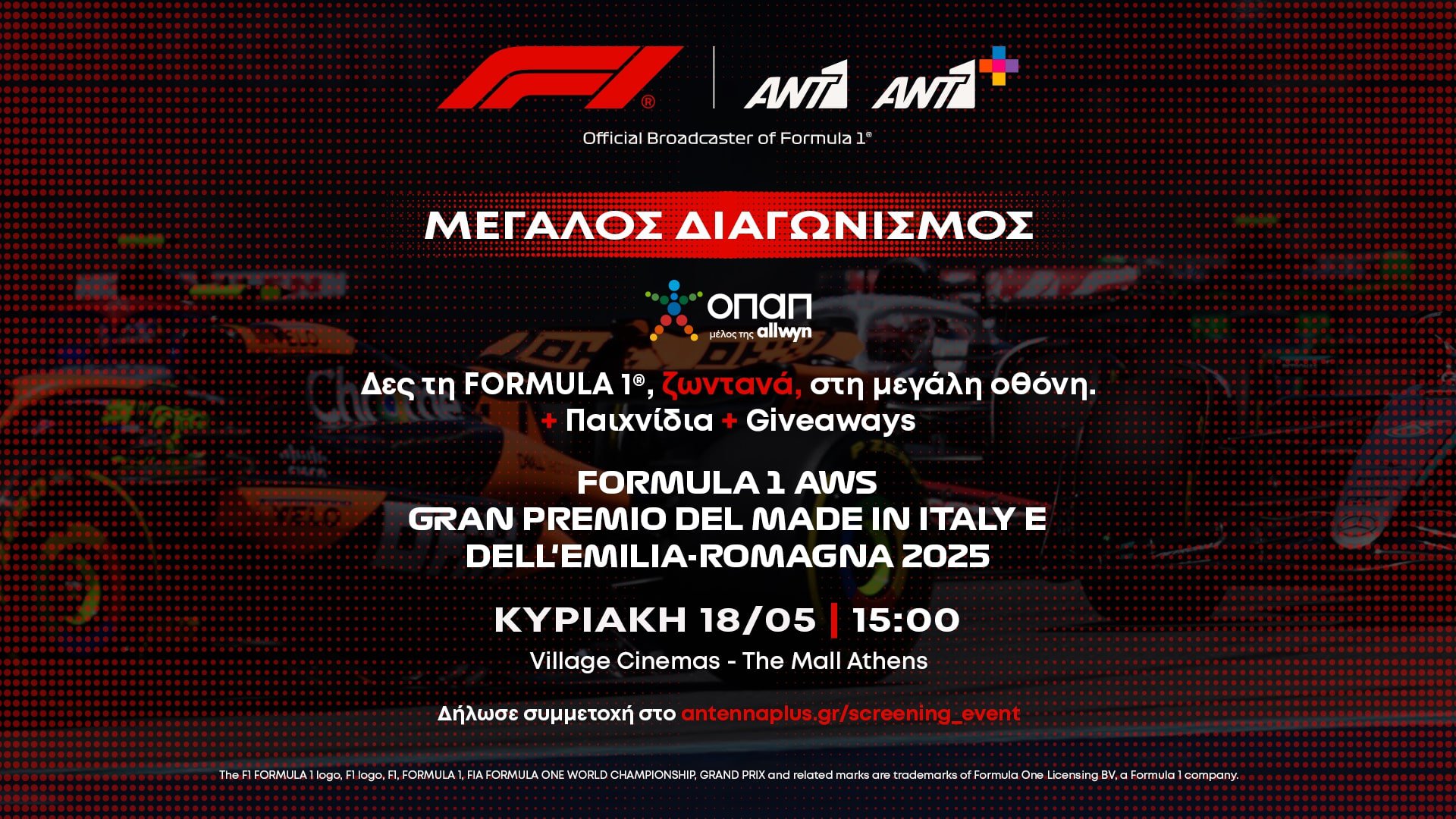 Την Κυριακή 18 Μαΐου, στις 15:00, ο 7ος αγώνας του Παγκοσμίου Πρωταθλήματος Formula 1 προβάλλεται στη μεγάλη οθόνη, με εικόνα και ήχο υψηλών προδιαγραφών, προσφέροντας μια ξεχωριστή εμπειρία. Πριν την εκκίνηση, στο φουαγιέ της αίθουσας των Village Cinemas @ The Mall Athens, οι τυχεροί διαγωνιζόμενοι θα έχουν την ευκαιρία να δοκιμάσουν τις ικανότητές τους σε ειδικούς προσομοιωτές οδήγησης Formula 1, νιώθοντας την αδρεναλίνη των κορυφαίων οδηγών.
