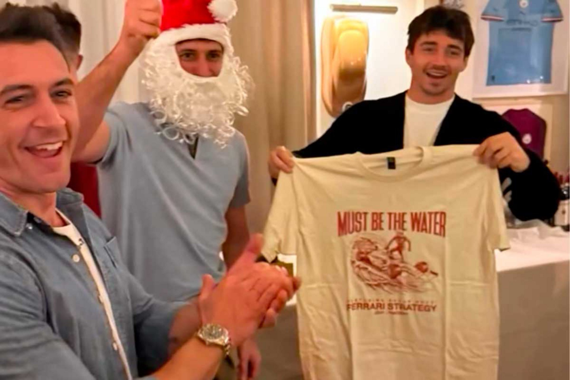 Ο άμεσης συνεργάτης του Leclerc τού δώρισε ένα t-shirt που γράφει πάνω «Must be the water», η... θρυλική ατάκα που ξεστόμισε εκείνος στο GP Αυστραλίας στην αρχή της χρονιάς, όταν ο οδηγός του τού είπε πως το cockpit είχε γεμίσει νερό λόγω της βροχής.