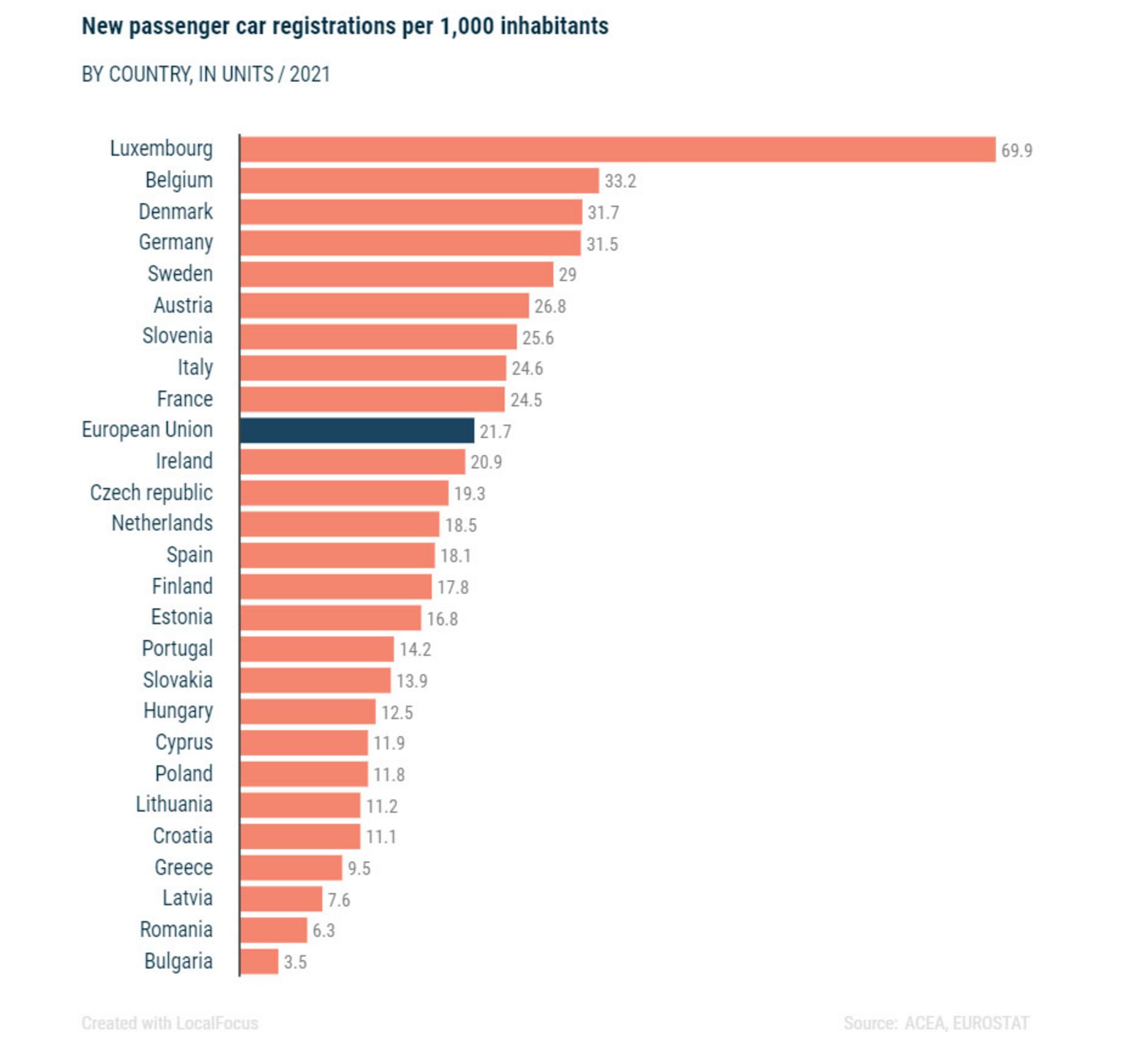 Απόρροια των παραπάνω - και βασικό πρόβλημα για το χώρο του αυτοκινήτου ταυτόχρονα - είναι επίσης το γεγονός ότι στην Ελλάδα, σύμφωνα με τα επίσημα στατιστικά στοιχεία της Ευρωπαϊκής Ένωσης Κατασκευαστών Αυτοκινήτων (ACEA), έχουμε 9,5 ταξινομήσεις καινούργιων ΙΧ ανά 1.000 κατοίκους το χρόνο όταν ο μέσος όρος της Ευρωπαϊκής Ένωσης είναι 21,7 αυτοκίνητα/1.000 κατοίκους. Ενώ αν πάμε στις προηγμένες χώρες της Ευρώπης το αντίστοιχο νούμερο είναι για τη Γερμανία 31,5, τη Σουηδία 29, την Αυστρία 26,8! Στην κορυφή της κατάταξης βρίσκεται το Λουξεμβούργο με 66,9 καινούργια αυτοκίνητα κάθε χρόνο ανά 1.000 κατοίκους!!!