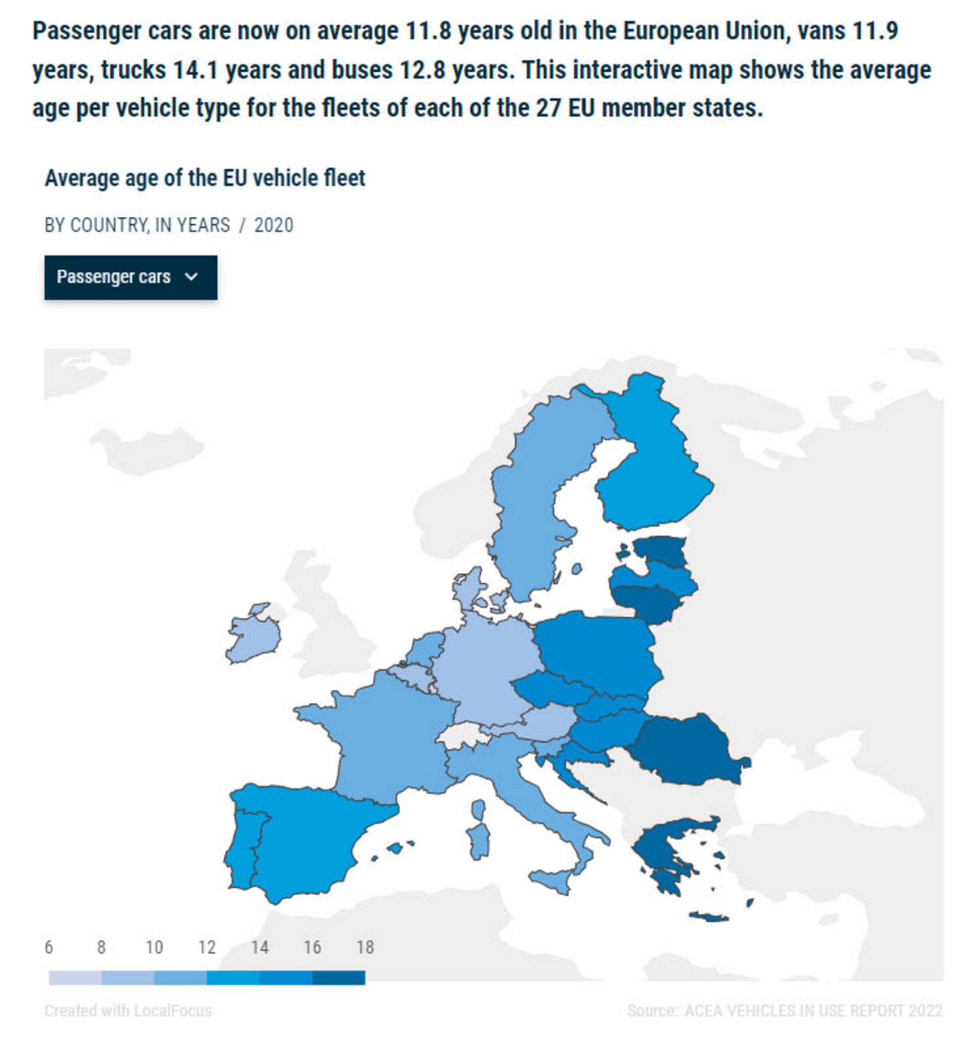 Τα επιβατικά αυτοκίνητα της ΕΕ έχουν, σύμφωνα με τα επίσημα στατιστικά στοιχεία της Ευρωπαϊκής Ένωσης Κατασκευαστών Αυτοκινήτων (ACEA), μέσο όρο ηλικίας τα 11,8 έτη. Στο χάρτη του ACEA που παραθέτουμε με σκούρο χρώμα απεικονίζονται οι χώρες με τα παλιότερα αυτοκίνητα. Η Λιθουανία και η Ρουμανία έχουν τους παλαιότερους στόλους αυτοκινήτων, με οχήματα ηλικίας σχεδόν 17 ετών, ενώ σε απόσταση αναπνοής από τους ουραγούς – 3η θέση από το τέλος – βρίσκεται η Ελλάδα με μέσο όρο ηλικίας τα 16,6 έτη (και οι τρεις επισημαίνονται με σκούρο μπλε). Τα πλέον «νεαρά», δηλαδή καινούρια επιβατικά αυτοκίνητα βρίσκονται στο Λουξεμβούργο (6,7 χρόνια).