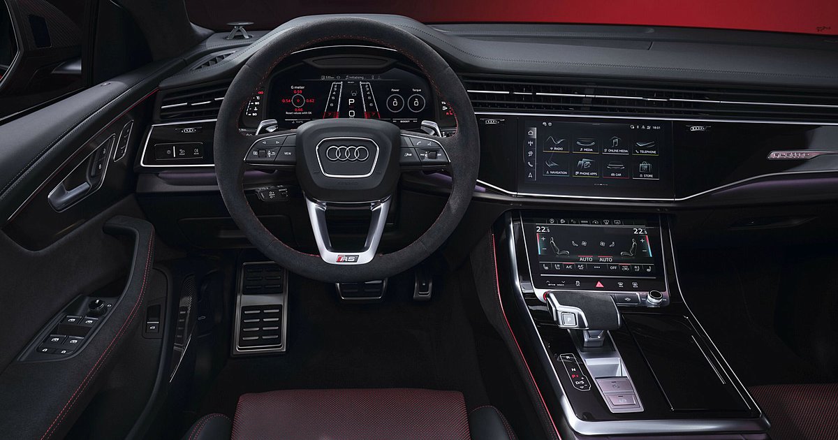 Για το εσωτερικό, τα πακέτα RS Design διατίθενται σε κόκκινο ή γκρι και αποκλειστικά για το RS Q8 SUV performance σε μπλε χρώμα. Τμήμα της κεντρικής κονσόλας, τα πατάκια, το τιμόνι και οι ζώνες ασφαλείας διαθέτουν κόκκινες ή γκρι ραφές. Οι ζώνες ασφαλείας είναι εξ ολοκλήρου σε Ocean Blue ως ειδικό χαρακτηριστικό του μπλε πακέτου RS Design. Το τιμόνι επενδύεται με Alcantara ενώ η λαβή του επιλογέα ταχυτήτων και τμήμα της κεντρικής κονσόλας καλύπτονται από Dinamica microfiber, επένδυση η οποία είναι κατασκευασμένη από ανακυκλωμένες ίνες PET.