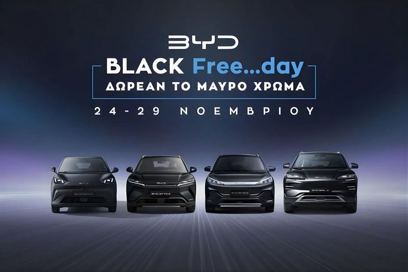 Η BYD μετατρέπει την Black Friday σε Black... Freeday, προσφέροντας δωρεάν το μαύρο χρώμα σε επιλεγμένα μοντέλα. Η προσφορά ισχύει για ετοιμοπαράδοτα ηλεκτρικών μοντέλων DOLPHIN SURF, ATTO 2, ATTO 3 και SEAL U EV, η BYD σας προσφέρει εντελώς δωρεάν το μαύρο χρώμα αξίας έως 1.100€, πλέον της κρατικής επιδότησης και του BYD Electric Bonus από 24 έως 29 Νοεμβρίου.