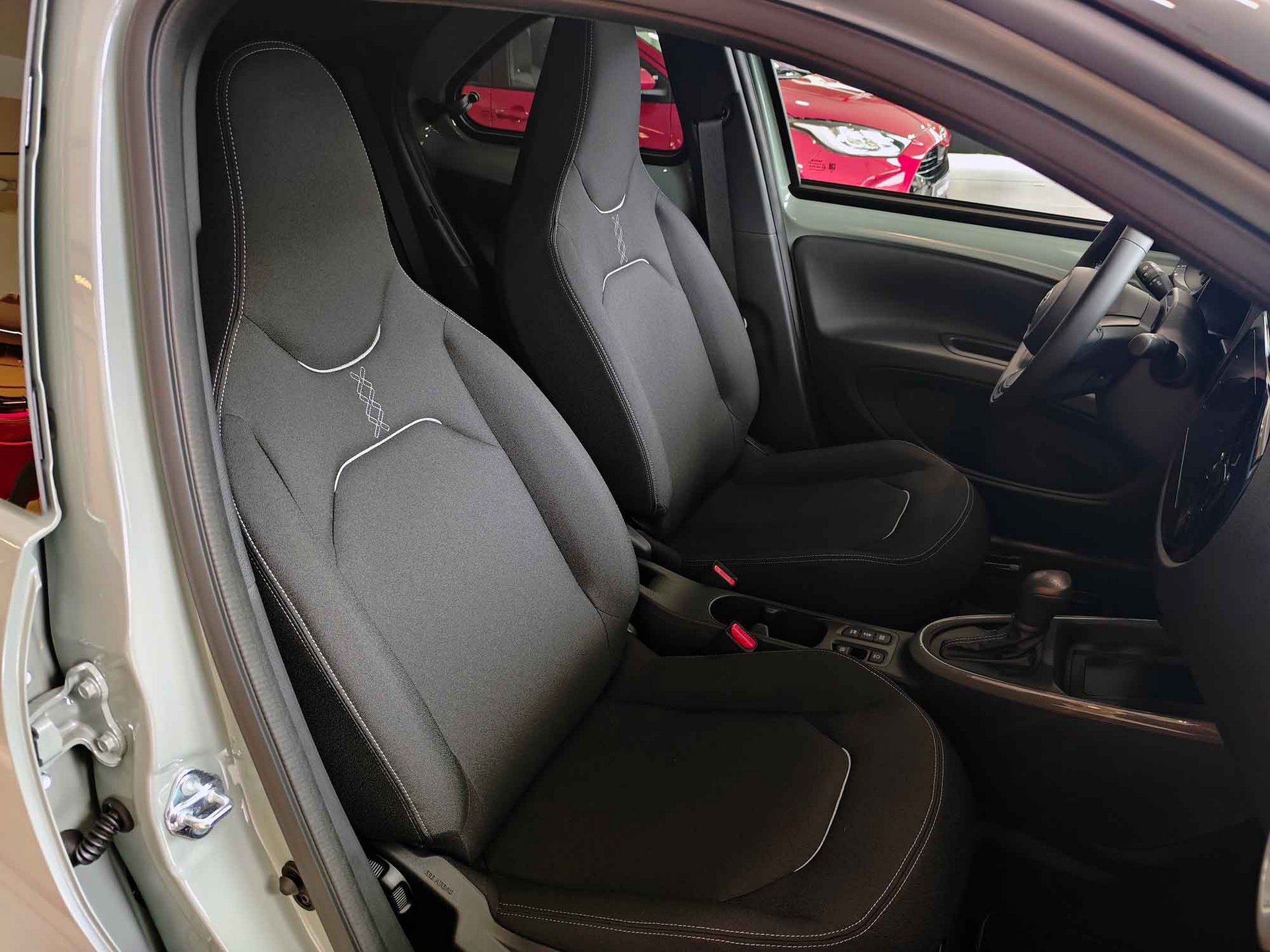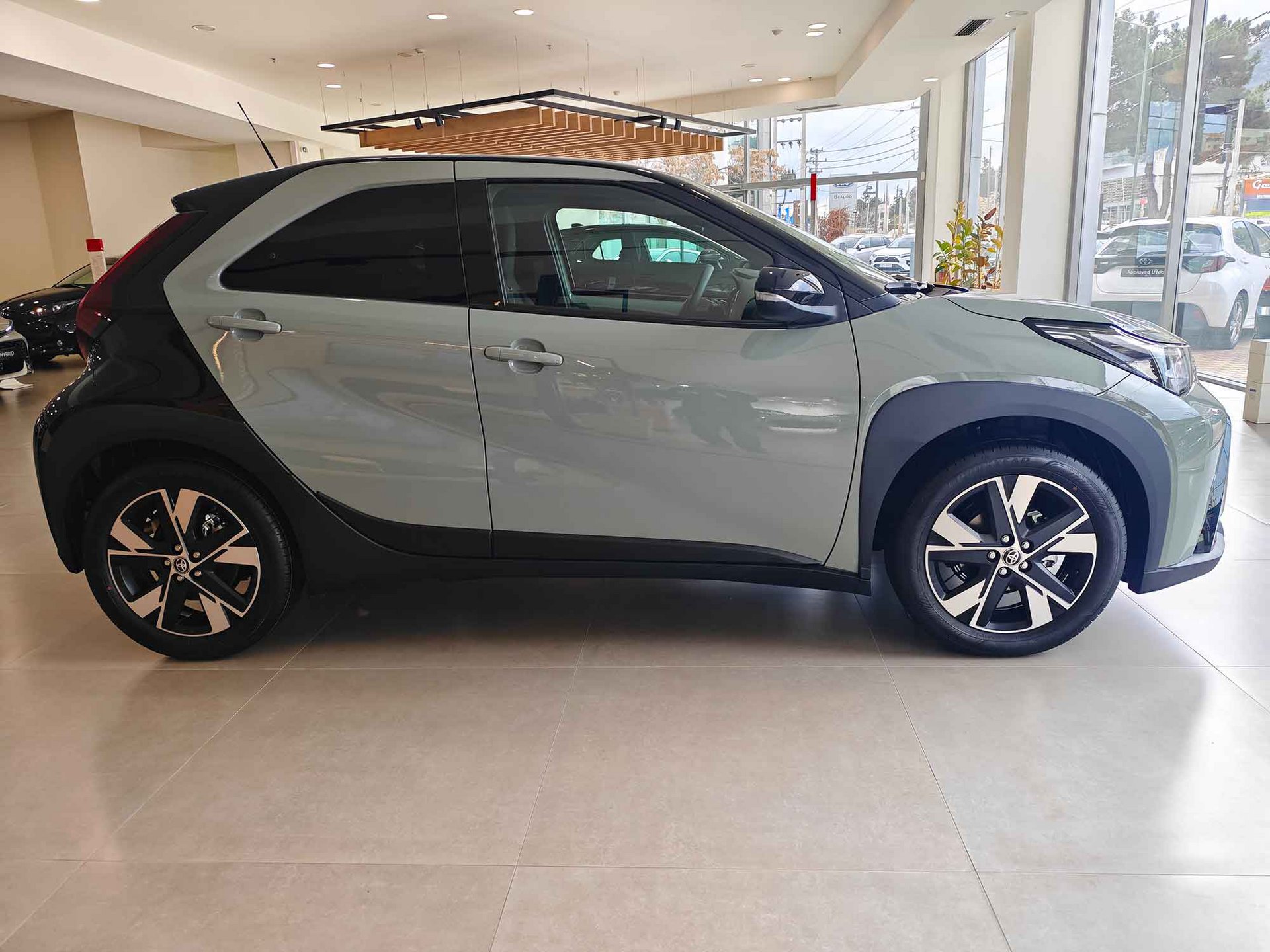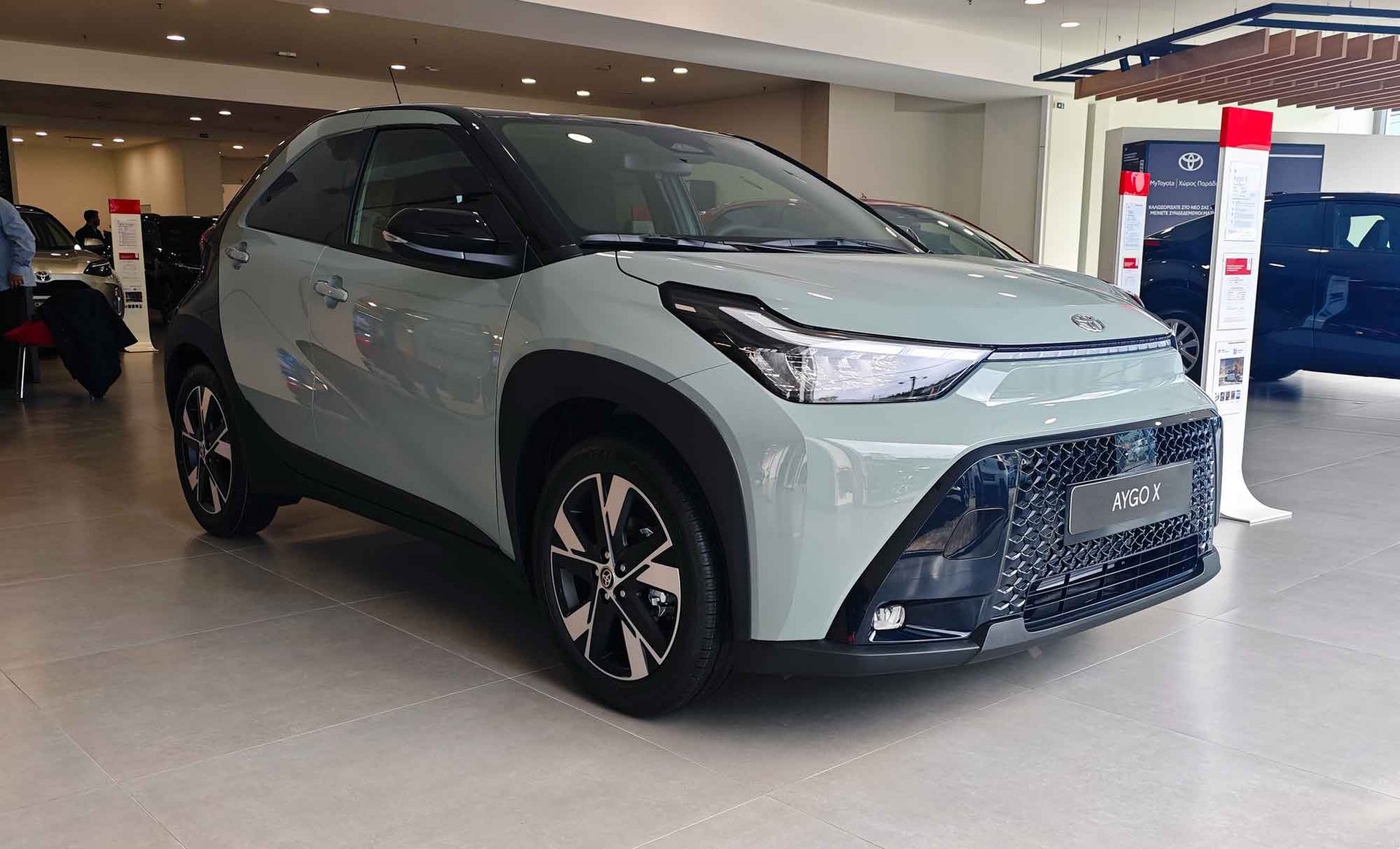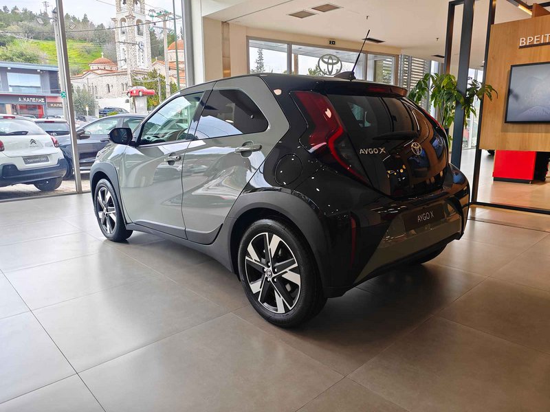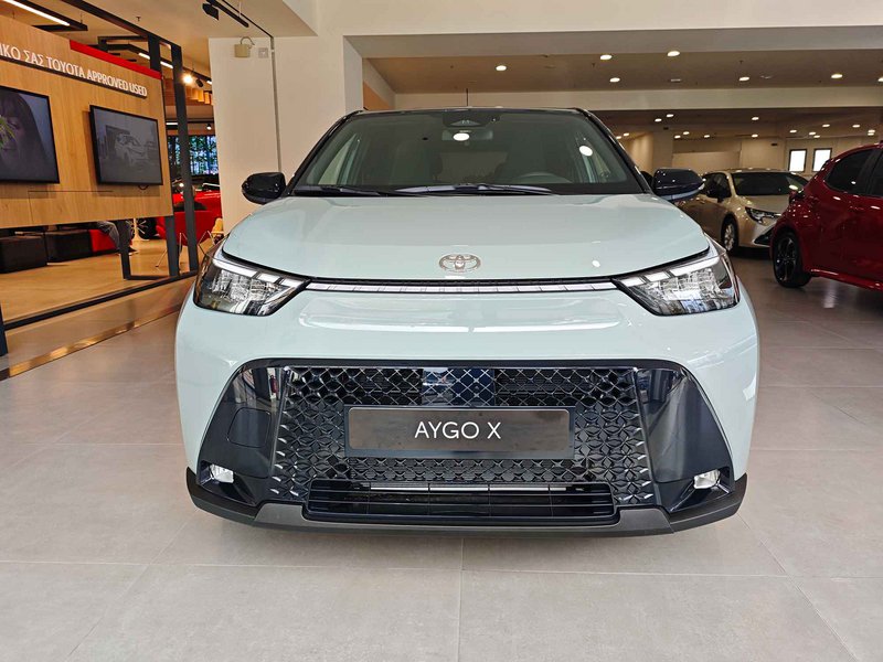 Εμφανισιακά, το εμπρός μέρος έχει επανασχεδιαστεί πλήρως, με νέα τρισδιάστατη μαύρη μάσκα που υιοθετεί το χαρακτηριστικό διπλό τραπεζοειδές σχήμα της Toyota, δίνοντας στο Aygo X πιο δυναμική εμφάνιση. Παράλληλα, τα φουσκωμένα φτερά, τα μαύρα προστατευτικά και οι ζάντες 17 ή 18 ιντσών ενισχύουν τον crossover χαρακτήρα.
