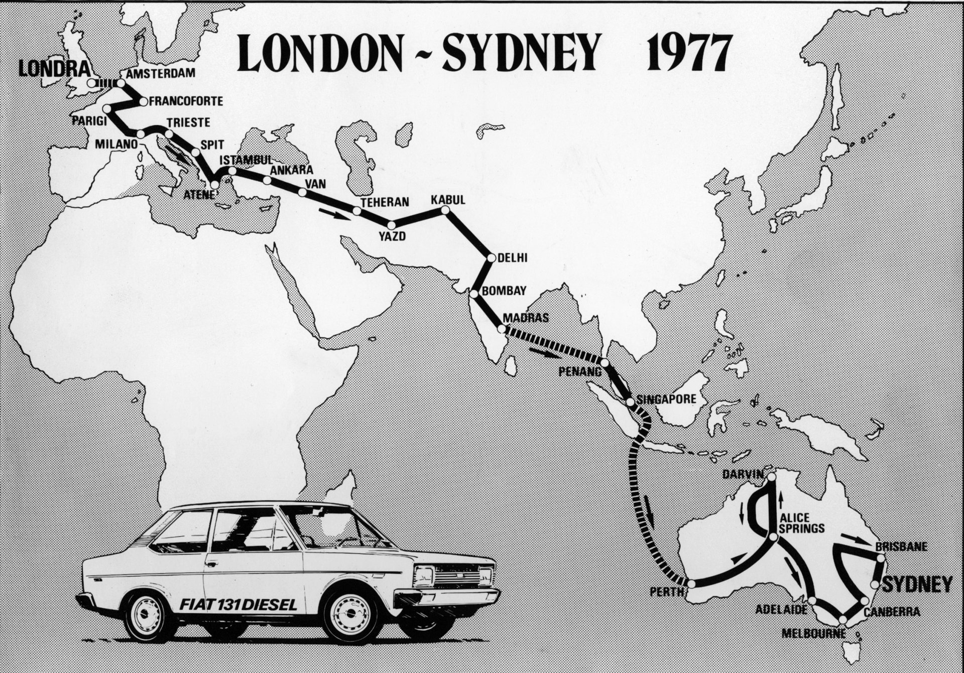 Στις 14 Αυγούστου του 1977, τρία Fiat 131 Abarth Diesel βρέθηκαν στην εκκίνηση στο διάσημο Covent Garden του Λονδίνου. Με τον αριθμό #6 η Γαλλική ομάδα των Robert Neyret και Marianne Hoepfner, με το #26 η Ιταλική ομάδα των Giancarlo Baghetti (πρώην οδηγού της Formula 1 με τις ομάδες των Ferrari, Lotus, Brabham, BRM και ATS) και Tommaso Carletti και τέλος με το νούμερο #66, η γυναικεία ομάδα των Evelyne Vanoni και Christine Dacremont. Συνολικά, από τη Βρετανική πρωτεύουσα ξεκίνησαν 80 αυτοκίνητα για τη μεγάλη περιπέτεια, ένα εκ των οποίον οδηγούσε ο Έλληνας Γιάννης Σταθάτος με συνοδηγό τον Δανό Erling Jensen.