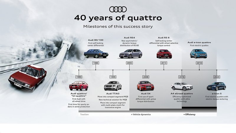 Το σύστημα τετρακίνησης quattro έγινε συνώνυμο με την Audi, καθώς εξελισσόταν συνεχώς στα χρόνια που ακολούθησαν. Από τα χειροκίνητα μπλοκέ διαφορικά του 1980 έως τους τρεις ηλεκτρικούς κινητήρες των νέων μοντέλων S στη γκάμα e-tron της Audi, το σύστημα quattro έχει περάσει από ατελείωτες ώρες εξέλιξης τα τελευταία 40 χρόνια, παραμένοντας στον πυρήνα της τεχνολογικής φαρέτρας της Audi.