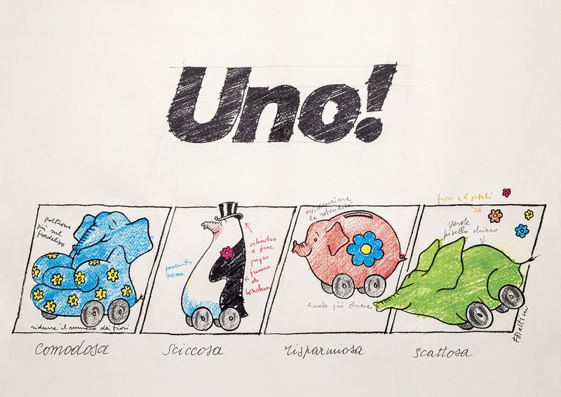 Δημιουργώντας τέσσερις συμπαθείς χαρακτήρες, δύο ελέφαντες, έναν πιγκουίνο και ένα γουρουνάκι-κουμπαρά, ο Forattini βρήκε τον πλέον ευρηματικό τρόπο για να επικοινωνήσει τα πλεονεκτήματα του Uno. Ο πρώτος ελέφαντας εξέφραζε την κορυφαία άνεση που προσέφερε το μοντέλο, ο πιγκουίνος την κομψότητα του, το γουρουνάκι την οικονομία και το δεύτερο ελεφαντάκι το δυναμικό χαρακτήρα του Uno.