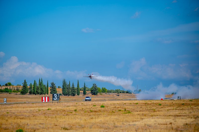Στο άκουσμα του «Go» από τον Μανώλη που βρισκόταν στον πύργο ελέγχου του αεροδρομίου της Τανάγρας, σανίδωσα το γκάζι στο πάτωμα. Με επιτάχυνση 0-100 km/h σε μόλις 3,6’’ το ΕΧ30 ξεχύθηκε μπροστά αφήνοντας πίσω του το μονοκινητήριο… Κάτι που δεν κράτησε πολύ αφού άκουσα τον βαθύ ήχο από τη διπλή εξάτμιση του ακτινικού κινητήρα να με πλησιάζει και σε μισό δεύτερο το 26ΜΧ χάθηκε στον αέρα σε climbing spin μέσα σε ένα σύννεφο λευκού show-off καπνού!