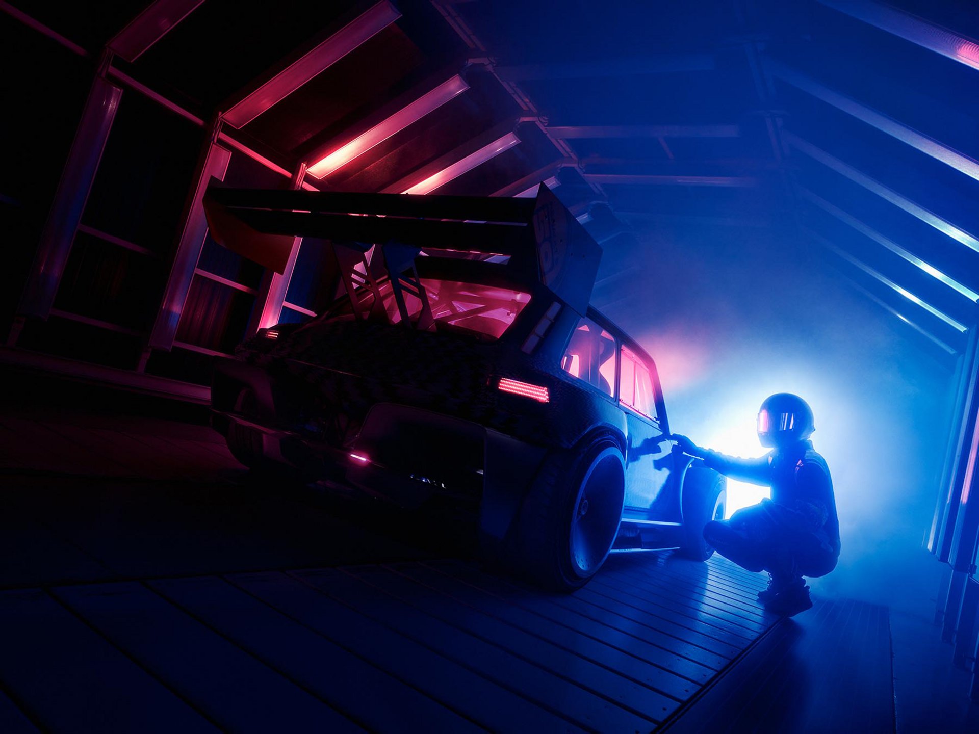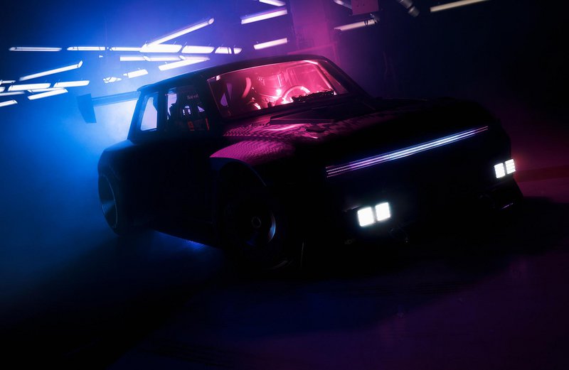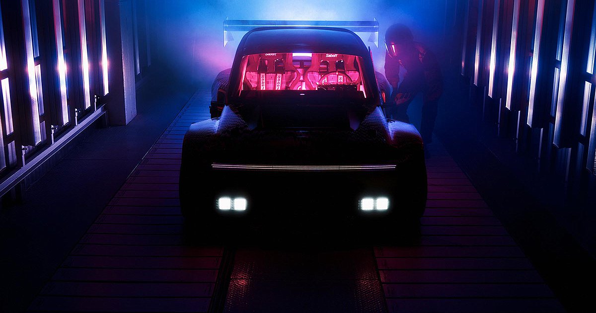 Αυτό που ξεχωρίζει αμέσως είναι οι εντυπωσιακά φαρδιοί θόλοι των τροχών και η τεράστια πίσω αεροτομή. Συνολικά υπάρχουν αρκετά… έντονα αεροδυναμικά στοιχεία σε διάφορα σημεία. Στο εμπρός μέρος το concept car διαθέτει μια μπάρα LED από τη μία άκρη ως την άλλη, σε συνδυασμό με δύο διπλά φώτα χαμηλά στον προφυλακτήρα, που παραπέμπουν στους αγώνες ράλι της εποχής.