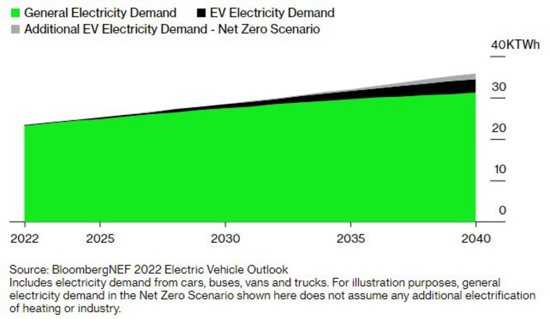 Σύμφωνα με το Bloomberg, το πιο ακραίο σενάριο, αυτό της πλήρους μετάβασης στον ηλεκτρισμό, που θα υπαγόρευε το 90%-100% των οχημάτων να είναι ηλεκτρικά, θα έφερνε αύξηση της κατανάλωσης κατά 27%.