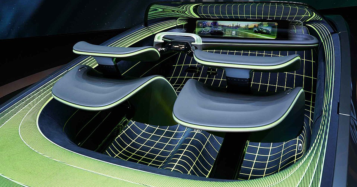 Στο εσωτερικό, η φουτουριστική σχεδίαση συνεχίζεται, με δύο «κυματιστά» καθίσματα και μια μοκέτα που μοιάζει με οπτική ψευδαίσθηση. Κυριαρχεί η ευρεία ψηφιακή οθόνη πολλαπλών λειτουργιών, που συνδυάζει το σύστημα infotainment και ένα ψηφιακό πίνακα οργάνων πίσω από το yoke τιμόνι.