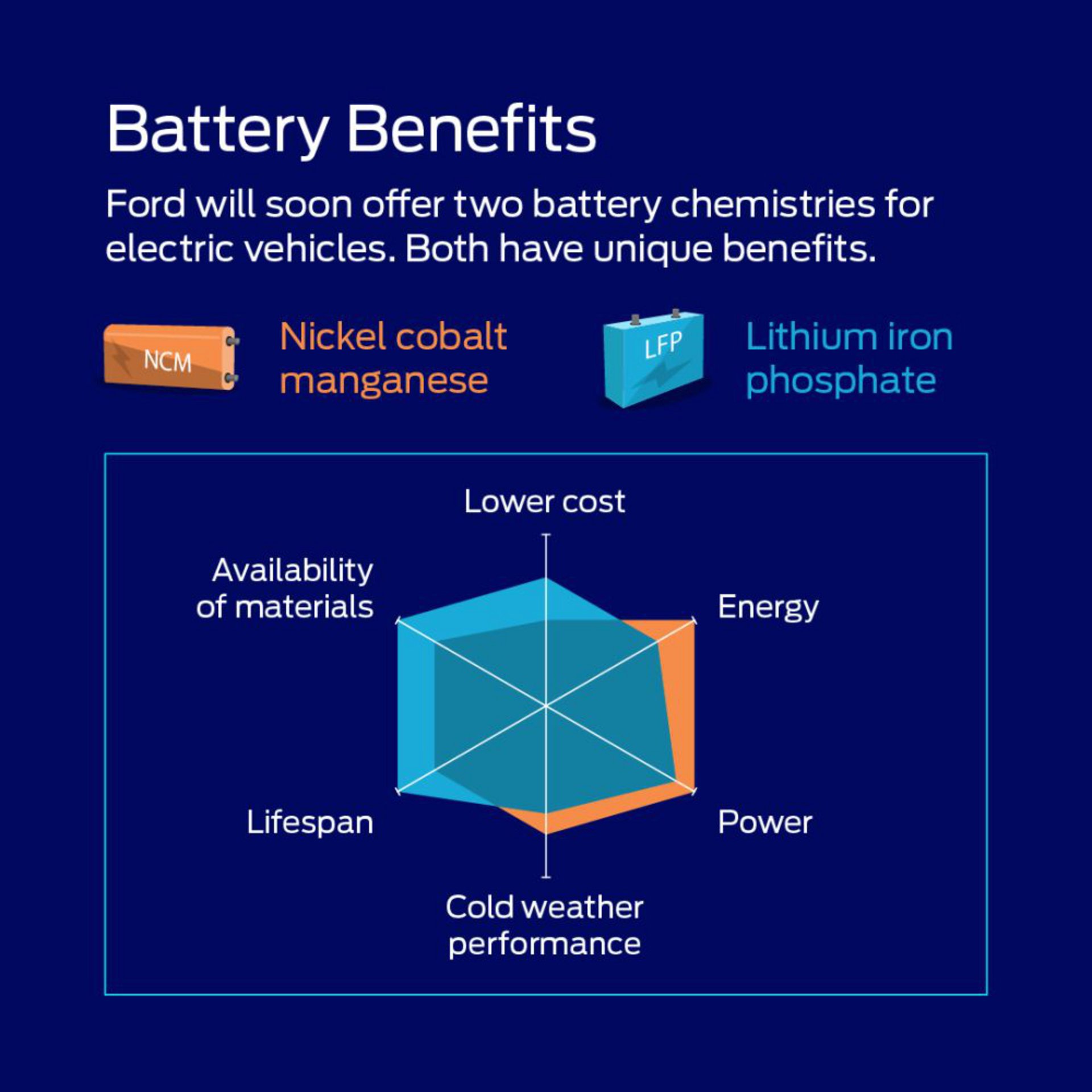 Προσφέροντας τις μπαταρίες με χημεία LFP ως εναλλακτική – πέραν των μπαταριών νικελίου- κοβαλτίου-μαγγανίου (NCM) - επιτρέπει στους πελάτες της Ford να επιλέξουν ένα ηλεκτρικό όχημα με μοναδικά χαρακτηριστικά απόδοσης μπαταρίας που ταιριάζει καλύτερα στις ανάγκες τους.