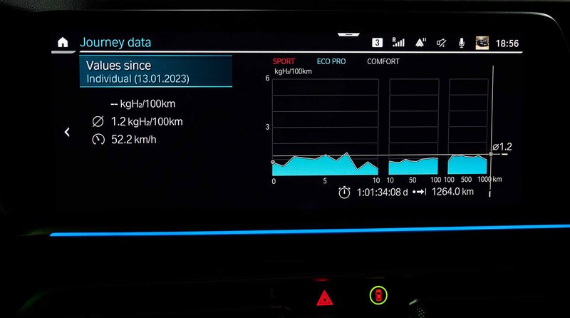 Και οι δύο μαζί χωράνε σχεδόν έξι κιλά υδρογόνου, τα οποία είναι αρκετά για να προσφέρουν στην BMW iX5 Hydrogen αυτονομία 504 km στον κύκλο WLTP. Η πλήρωση των δεξαμενών υδρογόνου διαρκεί μόλις τρία με τέσσερα λεπτά.