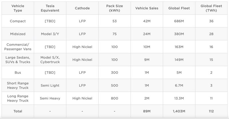 Το τρίτο μοντέλο που θα λανσάρει η Tesla μέσα στα επόμενα χρόνια είναι ένα λεωφορείο, το οποίο θα φέρει μπαταρίες τεχνολογίας LFP, χωρητικότητας 300 kWh, με την προβλεπόμενη αγοραστική δυνατότητα του μοντέλου να αγγίζει το 1 εκατ. πωλήσεων. Εκτός αυτού, το Cybertruck θα έρθει με μπαταρία χωρητικότητας 100 kWh, και τεχνολογία υψηλού νικελίου, όπως και το van.
