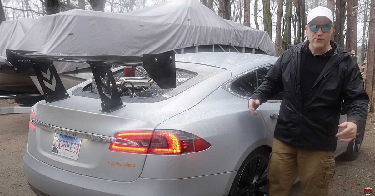 Μέσα από το κανάλι του Warped Perception στο YouTube παρουσίασε το δημιούργημά του: Τοποθέτησε στο πίσω μέρος του Tesla ένα μικρό turbo κινητήρα diesel, ισχύος 26 PS, ο οποίος είχε το ρόλο του range extender. Με άλλα λόγια, καλούνταν να φορτίζει την μπαταρία εν κινήσει, ώστε να μεγαλώνει η αυτονομία που προσφέρει και να μη χρειάζεται να σταματά συχνά για φόρτιση, μετατρέποντας το ηλεκτρικό όχημα σε υβριδικό.