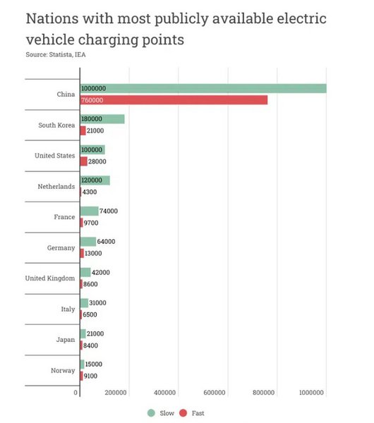 Μάλιστα δεν αναμένεται να χάσει σύντομα την πρωτιά αφού στη δεύτερη θέση είναι η Κορέα με μόλις 201.000 φορτιστές, εκ των οποίων οι 21.000 ταχυφορτιστές.