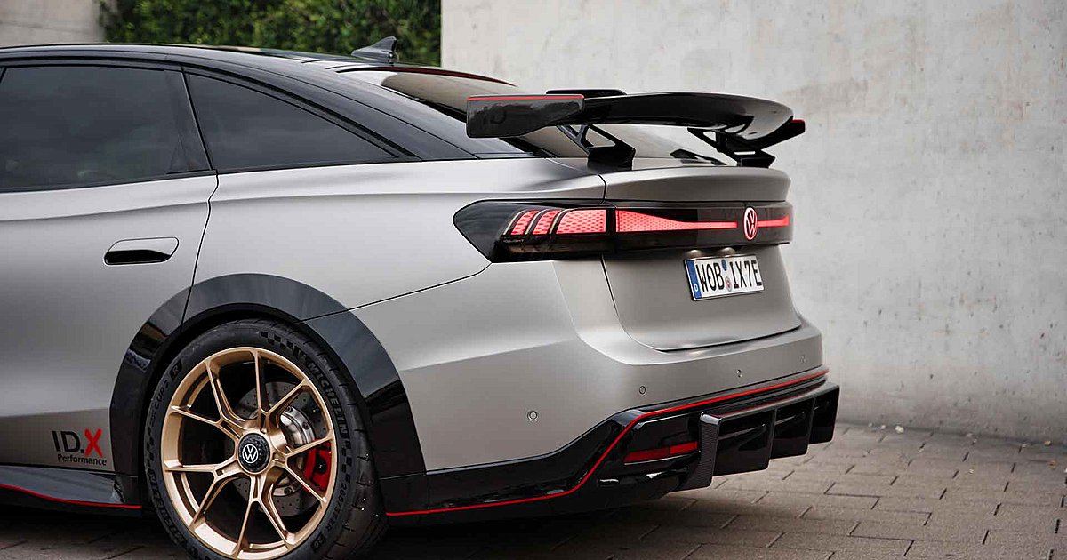 Εξωτερικά, το ID.X Performance ξεχωρίζει από τη μεγάλη μαύρη μάσκα στη βάση του ανανεωμένου προφυλακτήρα, τον εμπρός διαχωριστή κατασκευασμένο από ανθρακονήματα, όπως και ο πίσω διαχύτης. Επιπλέον, στο πίσω μέρος δεσπόζει η αεροτομή, επίσης από ανθρακονήματα, η οποία εξασφαλίζει την απαραίτητη κάθετη δύναμη.