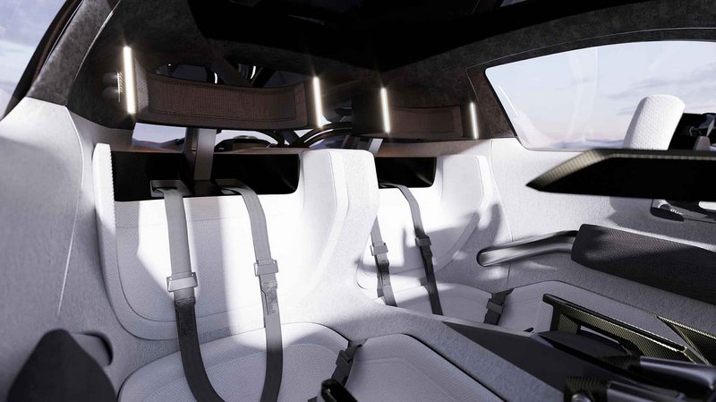 Η είσοδος σε αυτό γίνεται με τις δύο πόρτες να ανοίγουν προς τα πάνω, ενώ τα ανοίγματα είναι καλυμμένα με αφρώδες υλικό για να προστατεύουν τους αγκώνες. Τα δύο bucket καθίσματα προσφέρουν έντονη στήριξη, αλλά όχι σε βάρος της άνεσης. Είναι διακοσμημένα σε σχεδόν λευκό φινίρισμα, με μεγάλα προσκέφαλα που θυμίζουν αγωνιστικά αυτοκίνητα.