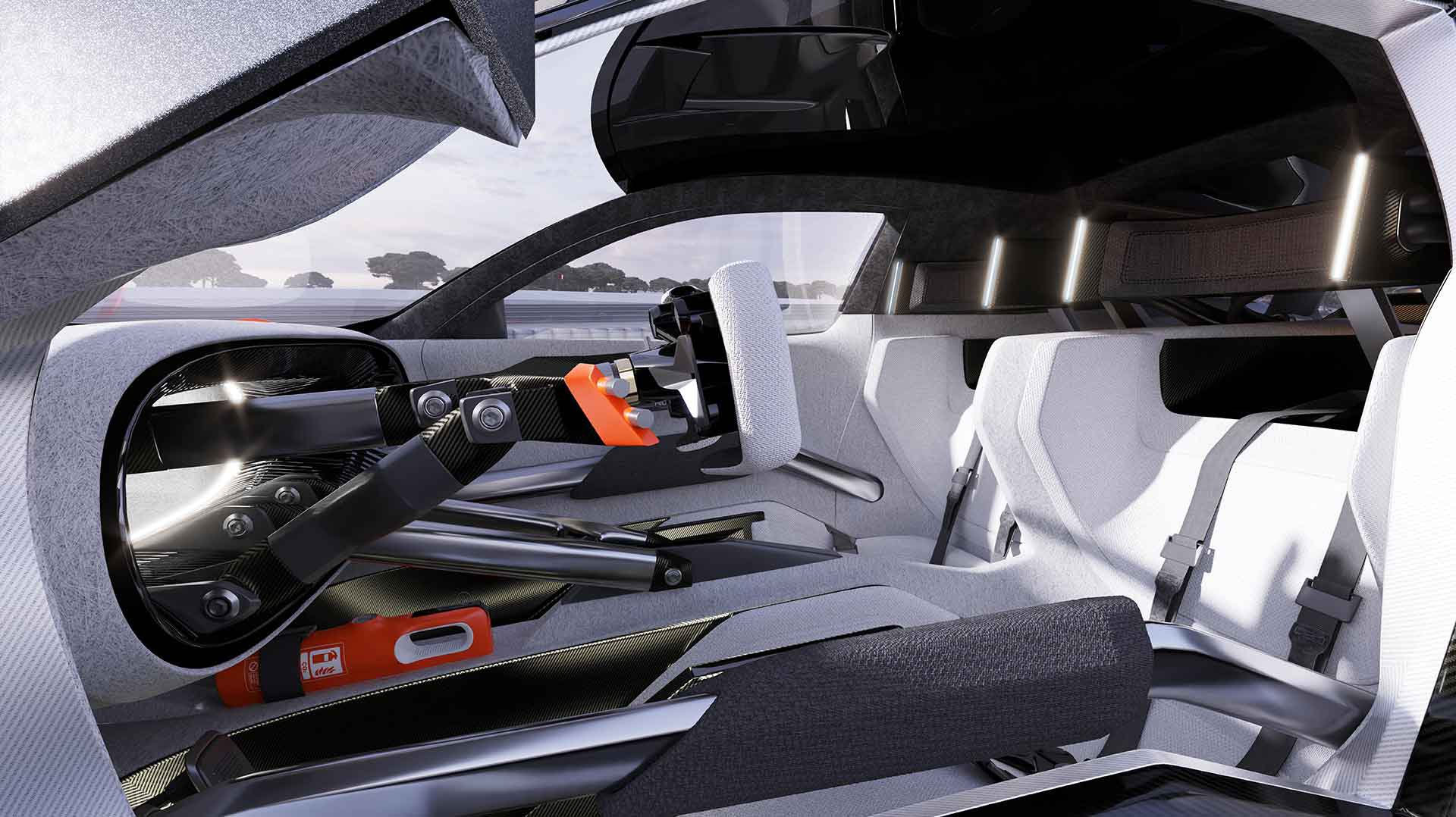 Συνολικά το εσωτερικό αποτελεί μια φουτουριστική ερμηνεία ενός «γυμνού» αγωνιστικού αυτοκινήτου, με οθόνες που δείχνουν μόνο τις βασικές πληροφορίες.