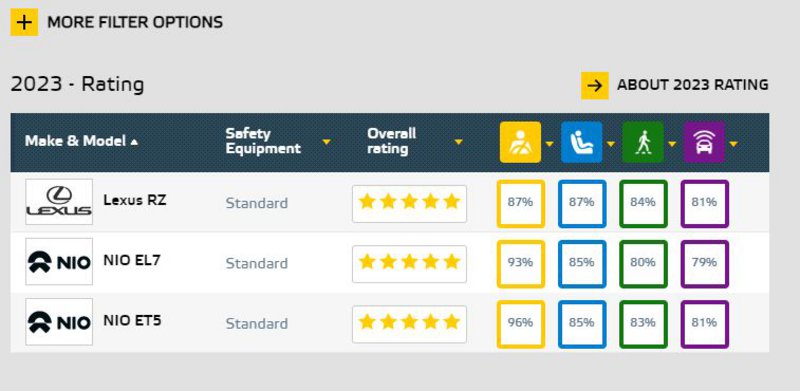 Μπαίνοντας κάποιος στο επίσημο site του Euro NCAP μπορεί να βρει τη λίστα με τα αυτοκίνητα που κέρδισαν τα πέντε αστέρια για το 2023 και τα οποία συγκέντρωσαν την υψηλότερη βαθμολογία. Εκεί θα διαπιστώσει ότι στην πρώτη θέση βρίσκεται το πρώτο μοντέλο της Lexus που σχεδιάστηκε εξαρχής ως ηλεκτρικό, το RZ.
