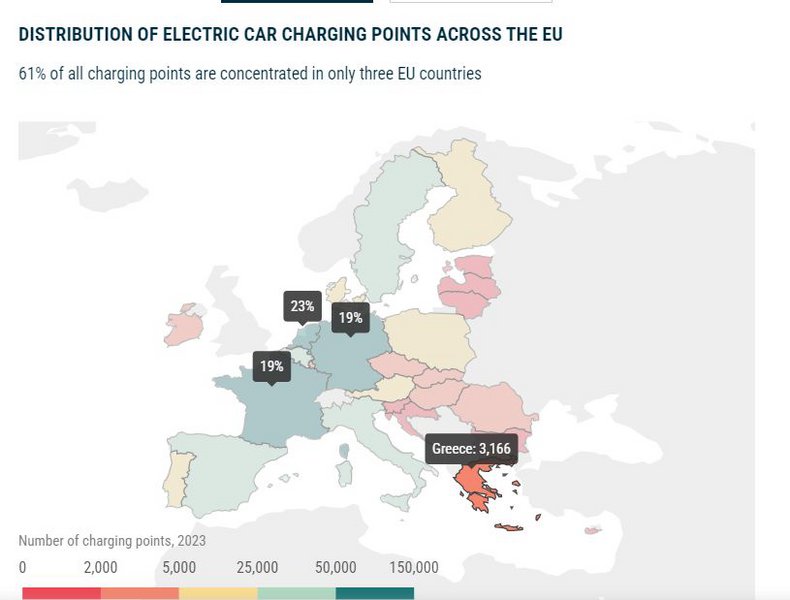 Η Ελλάδα, σύμφωνα με τον χάρτη που δημοσίευσε ο ACEA, έχει 3.166 δημόσια σημεία φόρτισης και είναι στο ίδιο «γκρουπ» με χώρες όπως η Ιρλανδία (2.825), η Ρουμανία (2.754), η Ουγγαρία (3.319) και η Σλοβακία (2.380).