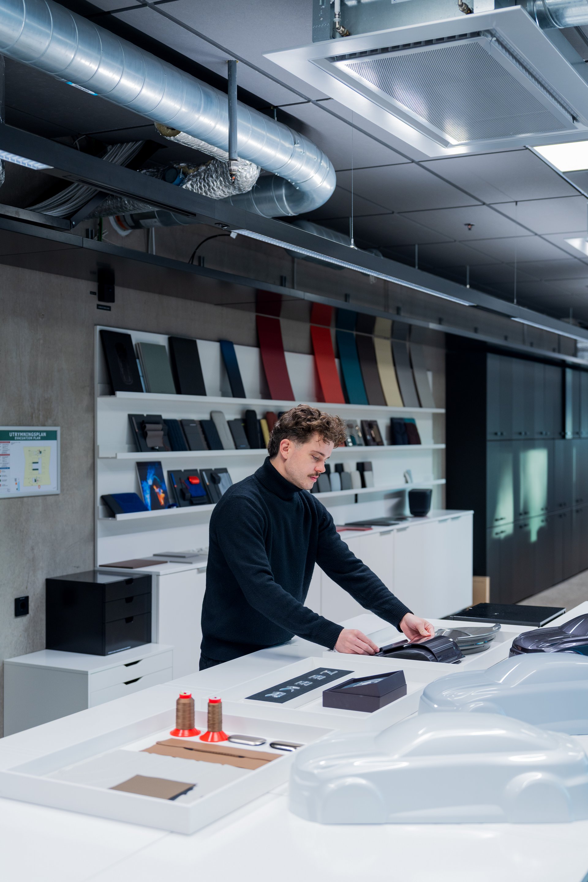 Ο χώρος αποπνέει δημιουργικότητα. Δεν θυμίζει βιομηχανικό εργαστήρι, αλλά ατελιέ σχεδιασμού. Εκεί μας υποδέχτηκε ο Gustaf Guner, Head of Brand Experience Design, ο οποίος μας ξενάγησε στους χώρους σχεδίασης, όπου κάθε λεπτομέρεια μελετάται με προσήλωση στην αρμονία και στην αίσθηση. «Στόχος μας είναι να εκφράσουμε το ευ ζην μέσα από τη σχεδίαση», μας είπε. «Η ισορροπία των γραμμών, οι χρωματισμοί, τα υλικά, όλα έχουν ρόλο. Θέλουμε ο οδηγός να νιώθει ότι το αυτοκίνητο είναι προέκταση της καθημερινότητάς του».