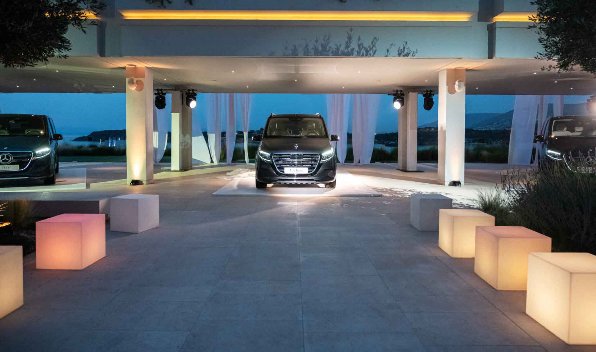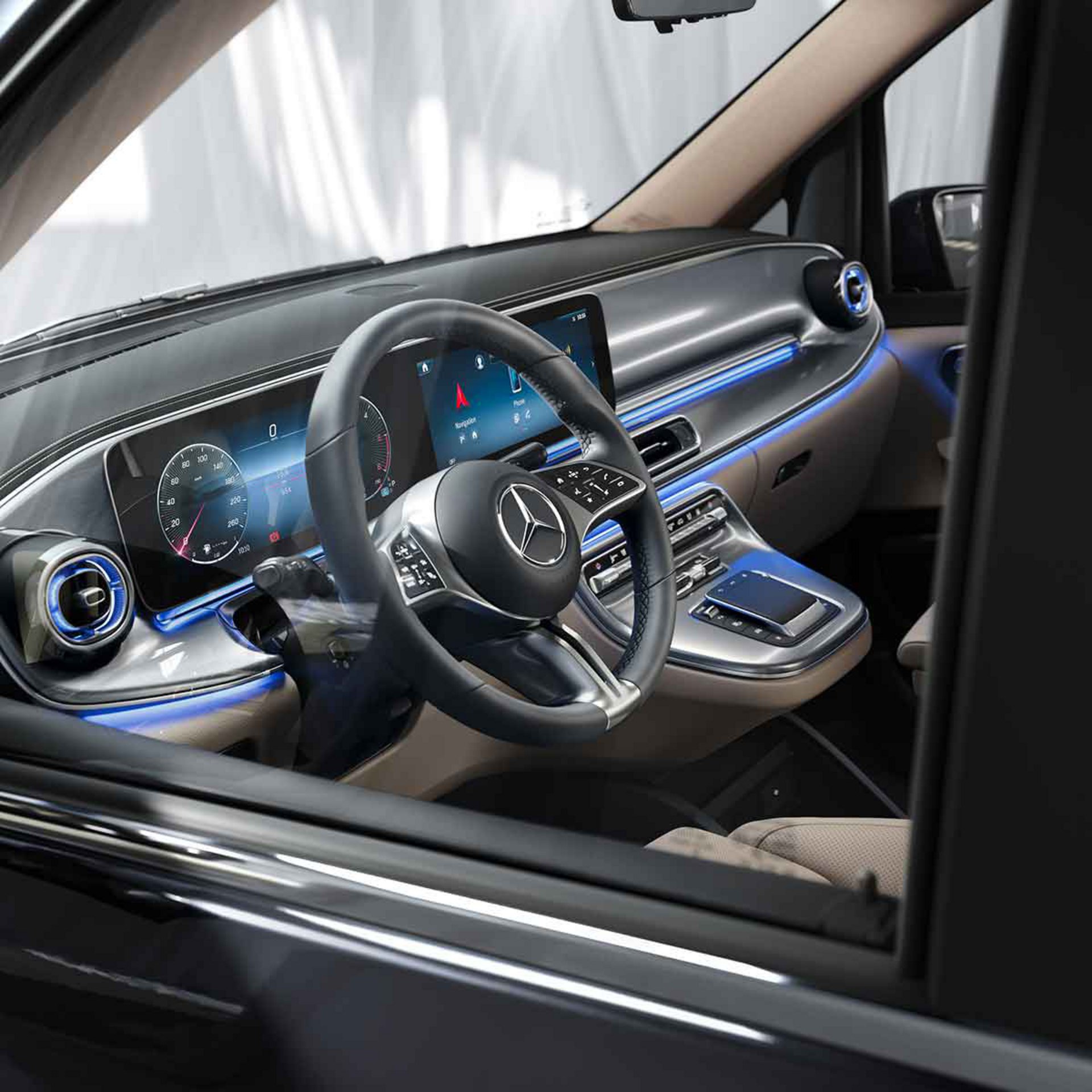 - Μεγαλύτερη άνεση χάρη στον ατμοσφαιρικό φωτισμό με 64 χρώματα και τη δεύτερη συρόμενη πόρτα για τις V Class και EQV