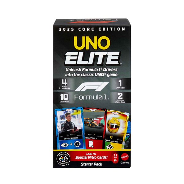 - Το UNO Elite Formula 1 2025 Core Edition Βασικό Πακέτο περιλαμβάνει 112 κάρτες που παίζονται όπως το κλασικό UNO, δύο αποκλειστικές promo κάρτες και τέσσερα game booster πακέτα, το καθένα με 10 κάρτες Elite Action, συμπεριλαμβανομένων οδηγών, μονοθέσιων οχημάτων, πίστες και κρανών.