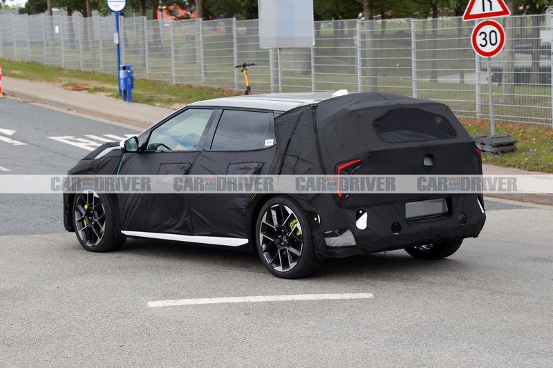 Χαρακτηριστικές είναι οι πράσινες δαγκάνες, που υποδεικνύουν ότι το EV υψηλών επιδόσεων θα φέρει μεγαλύτερα φρένα. Για το συγκεκριμένο πρωτότυπο δοκιμών, η Kia μοιάζει να έχει χρησιμοποιήσει ελαστικά Pirelli P Zero.