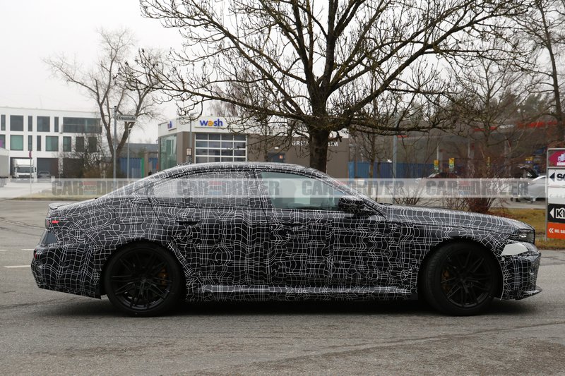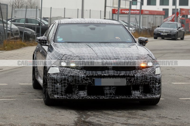 Το καμουφλάζ παραμένει έντονο, καλύπτοντας κάθε σπιθαμή του σπορ σεντάν, ωστόσο οι γραμμές και οι πιο «τρανταχτές» αλλαγές ξεχωρίζουν. Στο εμπρός μέρος, θα δει κανείς ότι η νέα M5 έχει πιο λεπτά φωτιστικά σώματα και αεραγωγούς, αντλώντας έμπνευση από τη σχεδιαστική γλώσσα της Neue Klasse που θα διατρέχει όλα τα νέα μοντέλα της μάρκας. Βλέπουμε, επίσης, ότι το πρωτότυπο δοκιμών εξοπλίζεται με ζάντες αλουμινίου 21 ιντσών, με ελαστικά 295 mm, και φρένα carbon-ceramic από το τμήμα M.