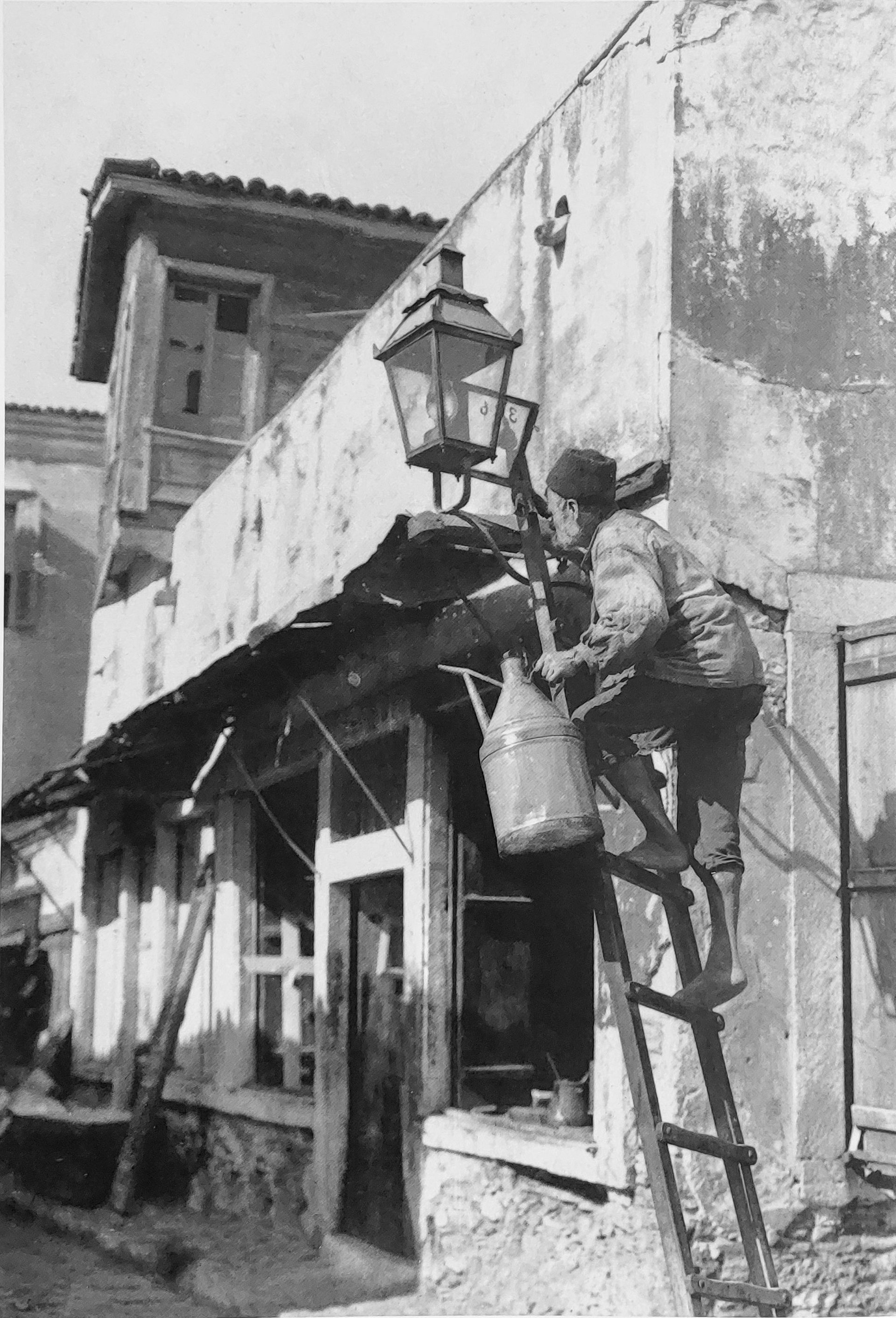 Ο φανοκόρος, εφοδιασμένος με το ειδικό δοχείο του φωτιστικού πετρελαίου, ετοιμάζεται να ανάψει φανάρι.  Το 1862 είχε ολοκληρωθεί το εργοστάσιο φωταερίου στο Γκάζι, ώστε τμήμα των Αθηνών να φωτιστεί με φωταέριο, αλλά στις φτωχογειτονιές επικρατούσε μαύρο σκοτάδι. Απέχουμε ακόμα από την εποχή του Χαρίλαου Τρικούπη.