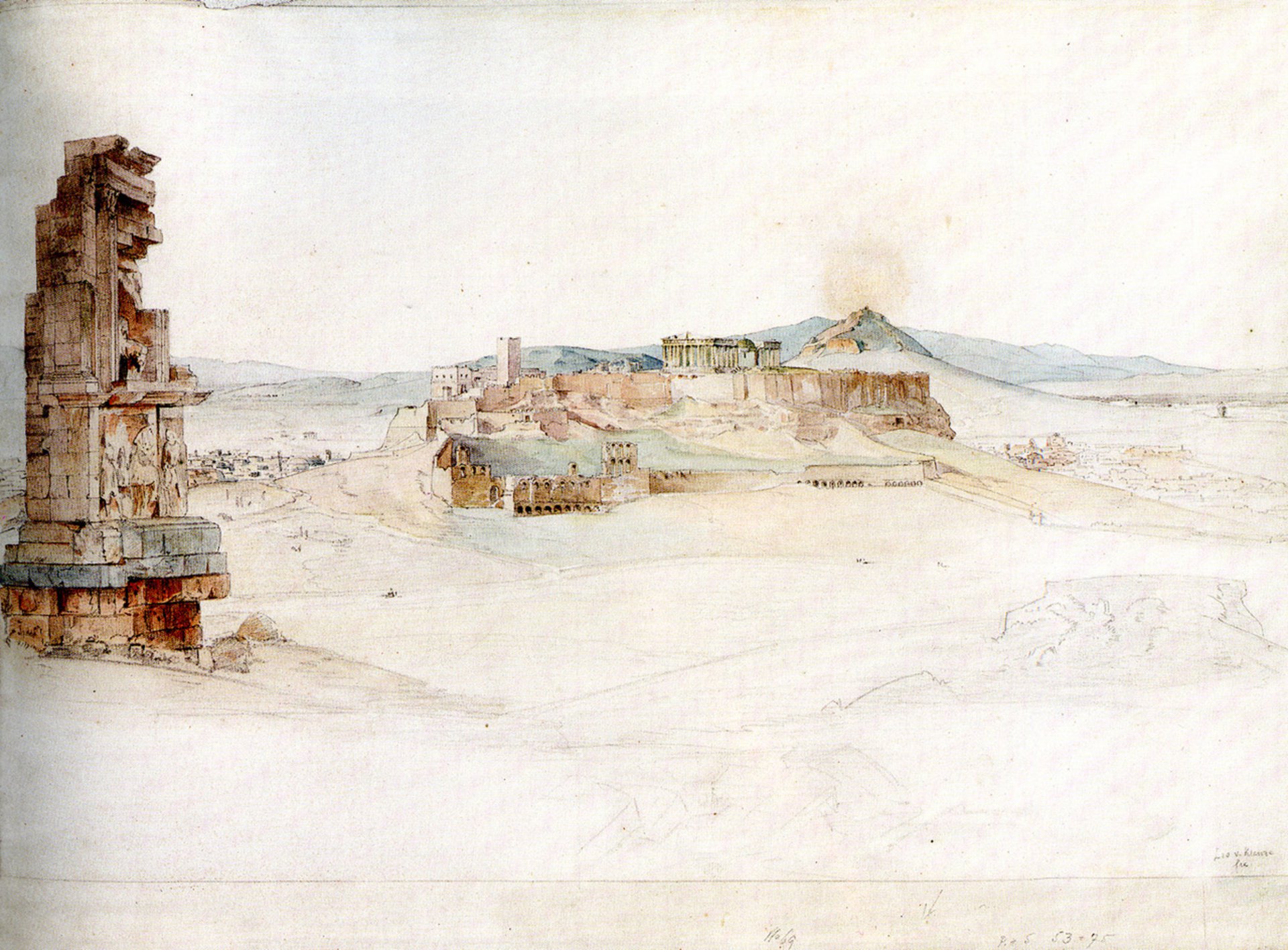 Λέο φον Κλέντσε, Η Αθήνα και η Ακρόπολη από τον λόφο του Φιλοπάππου, 1834, υδατογραφία, μελάνι και μολύβι, 48,1 Χ  65,5 εκ.