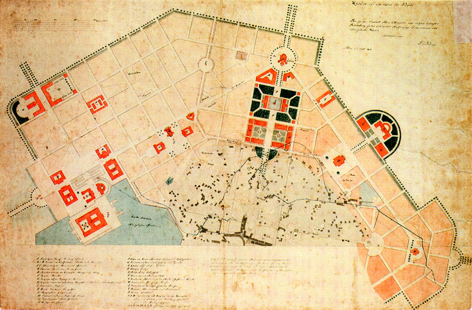 Λέο φον Κλέντσε, Σχέδιο της νέας πόλεως των Αθηνών, Αθήνα 7 Σεπτεμβρίου 1834.  Πρόκειται για σχέδιο που εγκρίθηκε στις 18/30 Σεπτεμβρίου 1834. Φέρει τις υπογραφές των μελών της Αντιβασιλείας Άρμανσμπεργκ, Μάουερ και Χάιντεκ.  Πένα και μελάνι, 115 Χ 75 εκ., κλίμακα: 1.2000.
