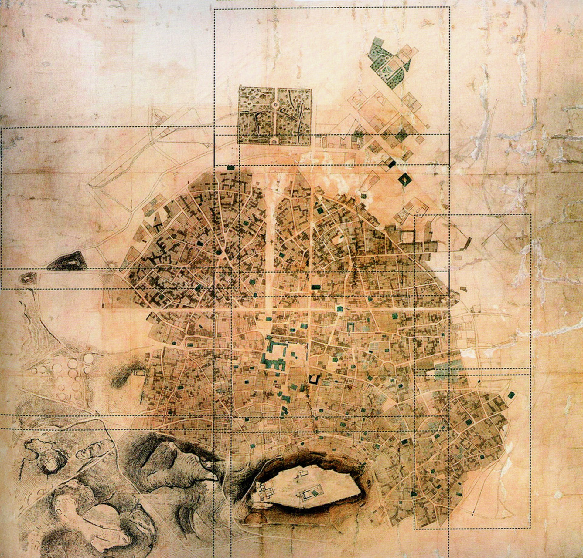 Φρ. Στάουφερτ, Ε. Σάουμπερτ και Χριστιανός Χάνσεν, Σχέδιο των Αθηνών, 1836. Διαγραμμίσεις του Μ. Κορρέ, Οι πρώτοι χάρτες της πόλεως των Αθηνών, Μέλισσα, 2010. Μαύρο, μπλε και κόκκινο μελάνι, περ. 147 Χ 144 εκ.